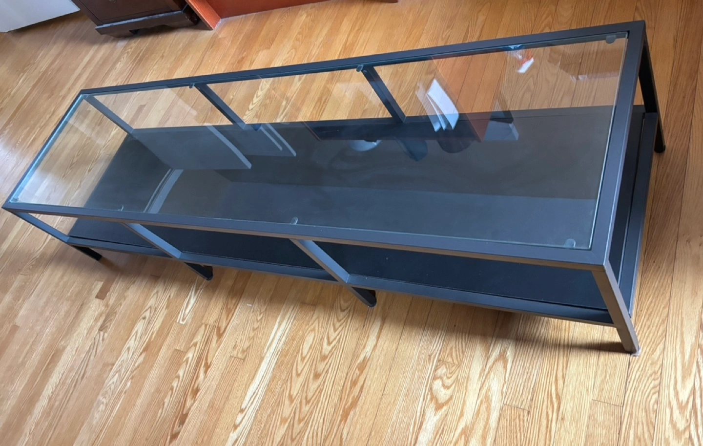 IKEA TV bench with tempered glass top and dark black metal frame. Features lower shelf for storage.