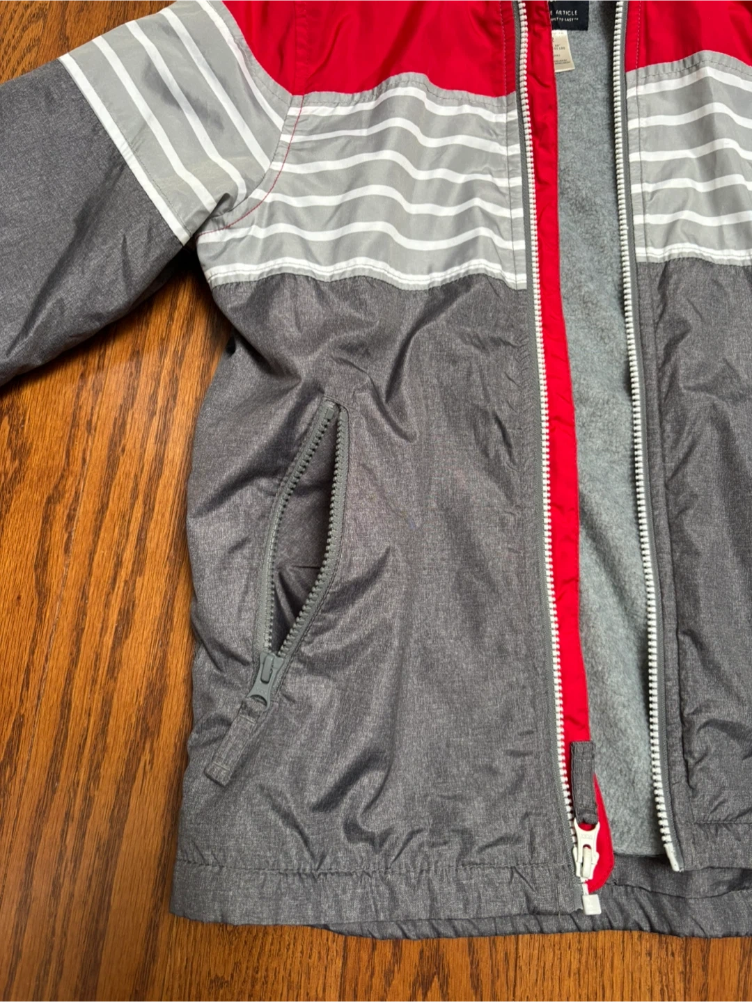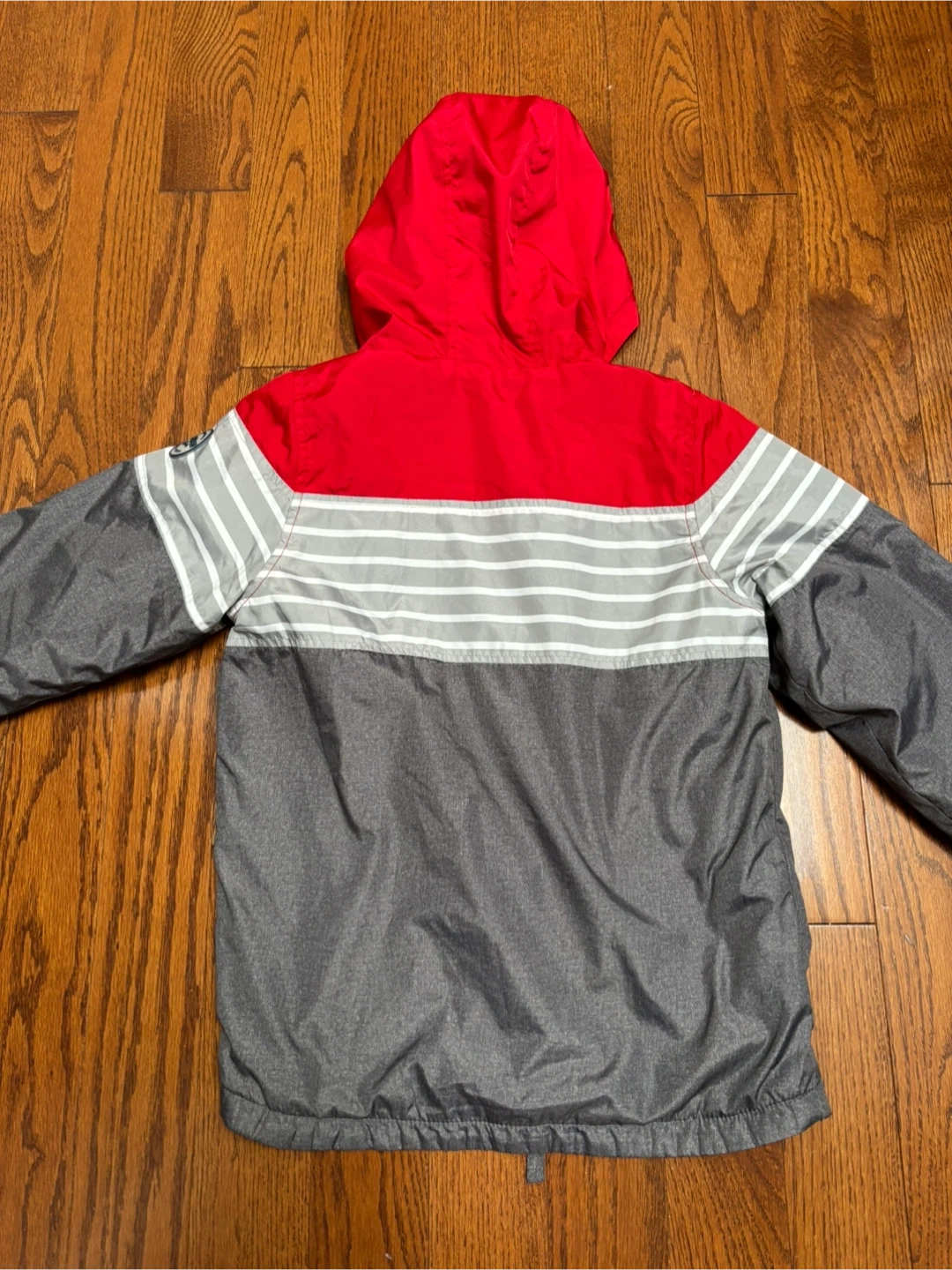 This OshKosh B'gosh jacket features a red and grey colour block design with white stripe accents. It has a full zip closure and two zip pockets. The interior is lined with soft grey fleece for added warmth. This jacket is perfect for layering on cooler days.