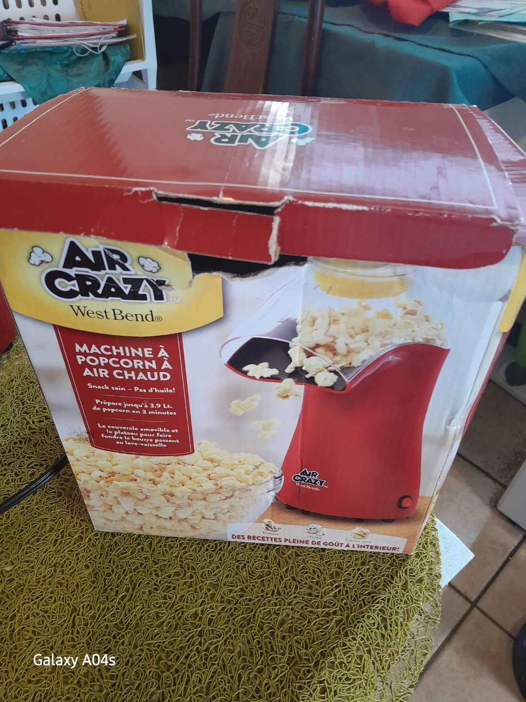 Red hot air popcorn popper. Makes up to 3. quarts of popcorn in 3 minutes. Dishwasher safe removable bowl and butter melting cup. Includes recipes.