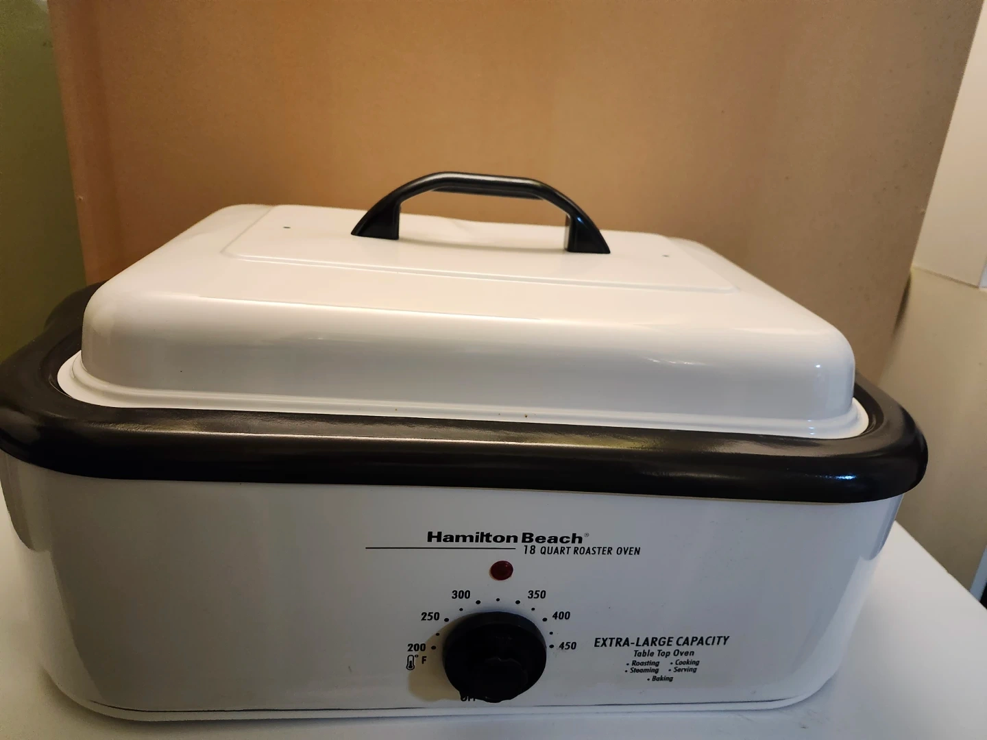 Never be used, This Hamilton Beach roaster oven is extra-large capacity at 18 quarts. It's white with a black trim and lid handle. The temperature goes from 200 to 450 degrees Fahrenheit and it's suitable for roasting, cooking, steaming, slow cooking, and baking. It's a versatile countertop appliance for any kitchen!. Price firm only cash only pickup no delivery 801 O'Connor drive outside TD Canada Trust bank door East York.