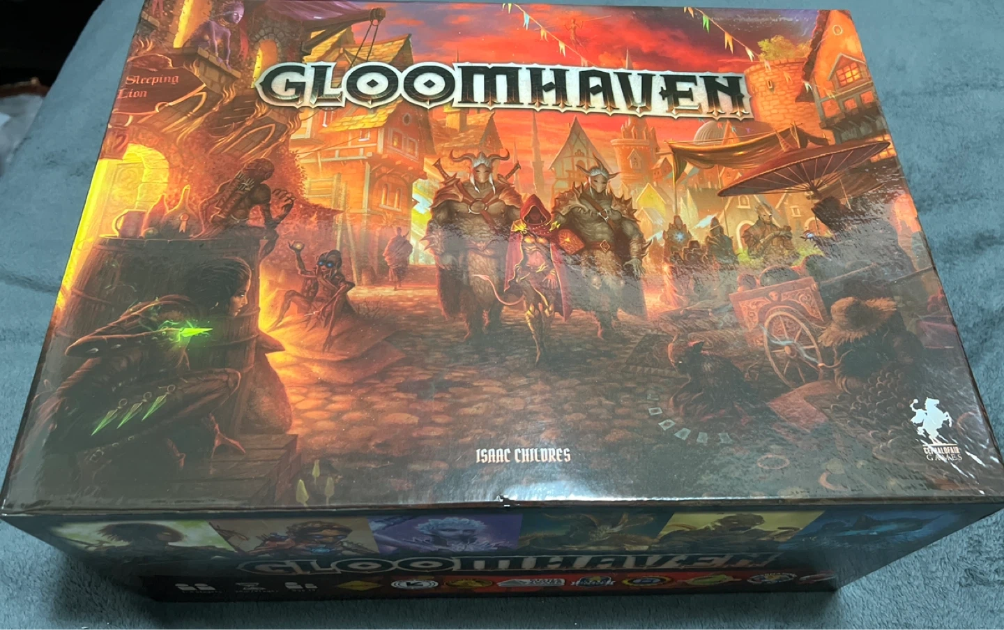 This is the Gloomhaven board game. It's designed for 1-4 players and takes about 30 minutes per player to complete. The recommended age is 14 and up. It has won several awards, including a Golden Geek award.