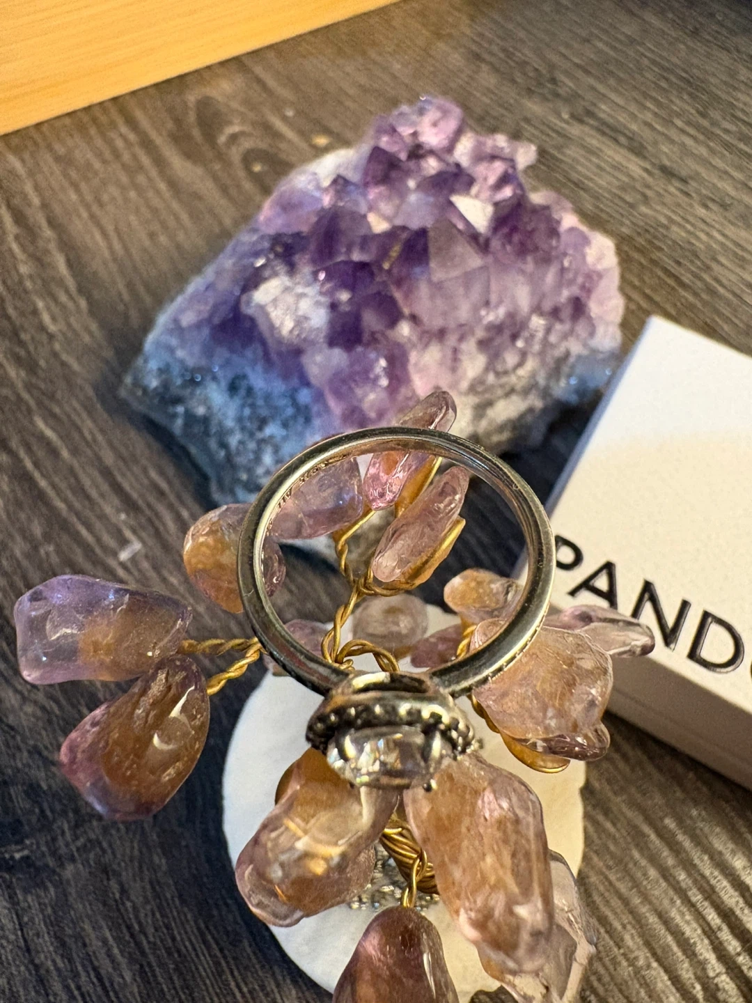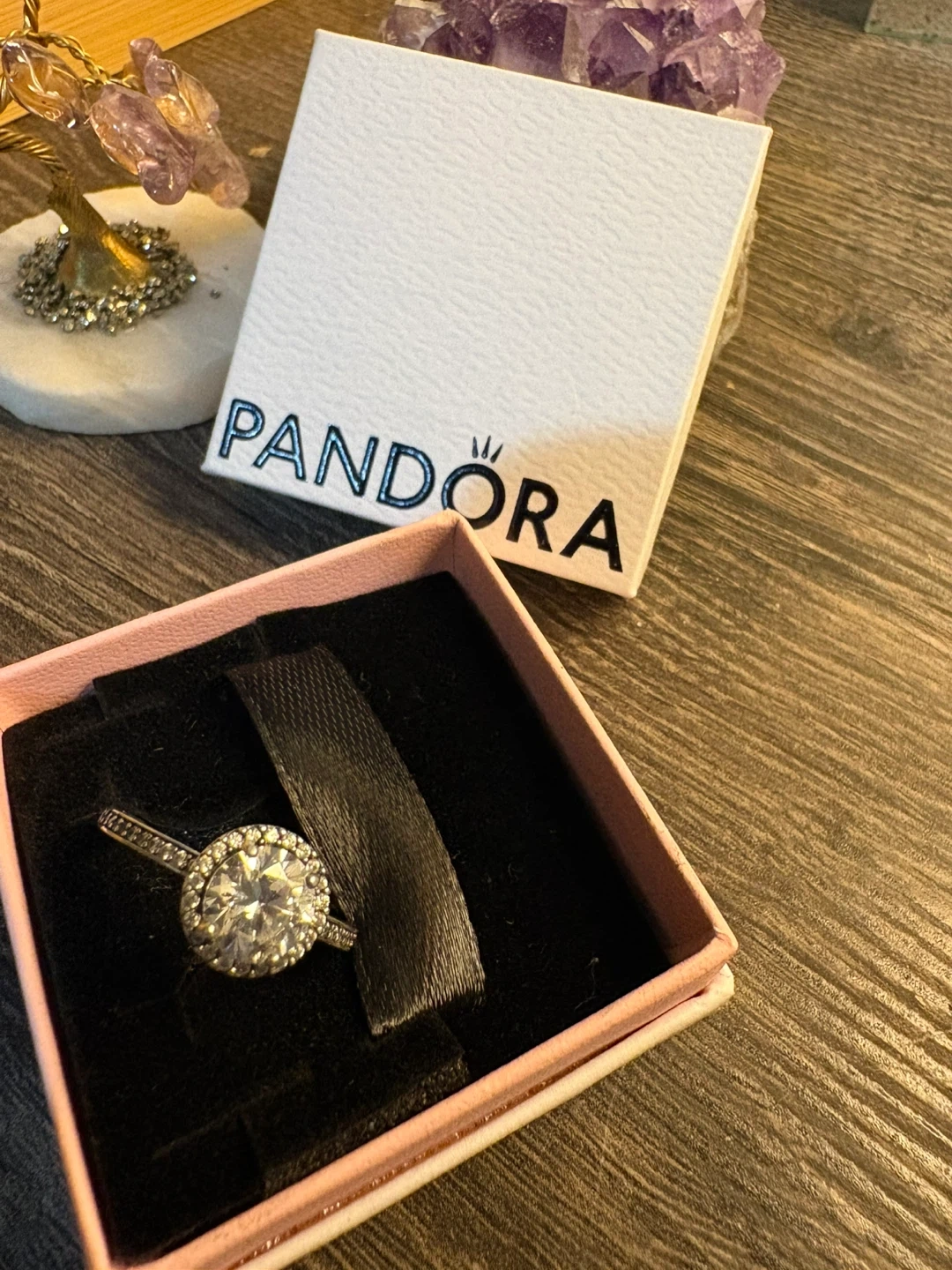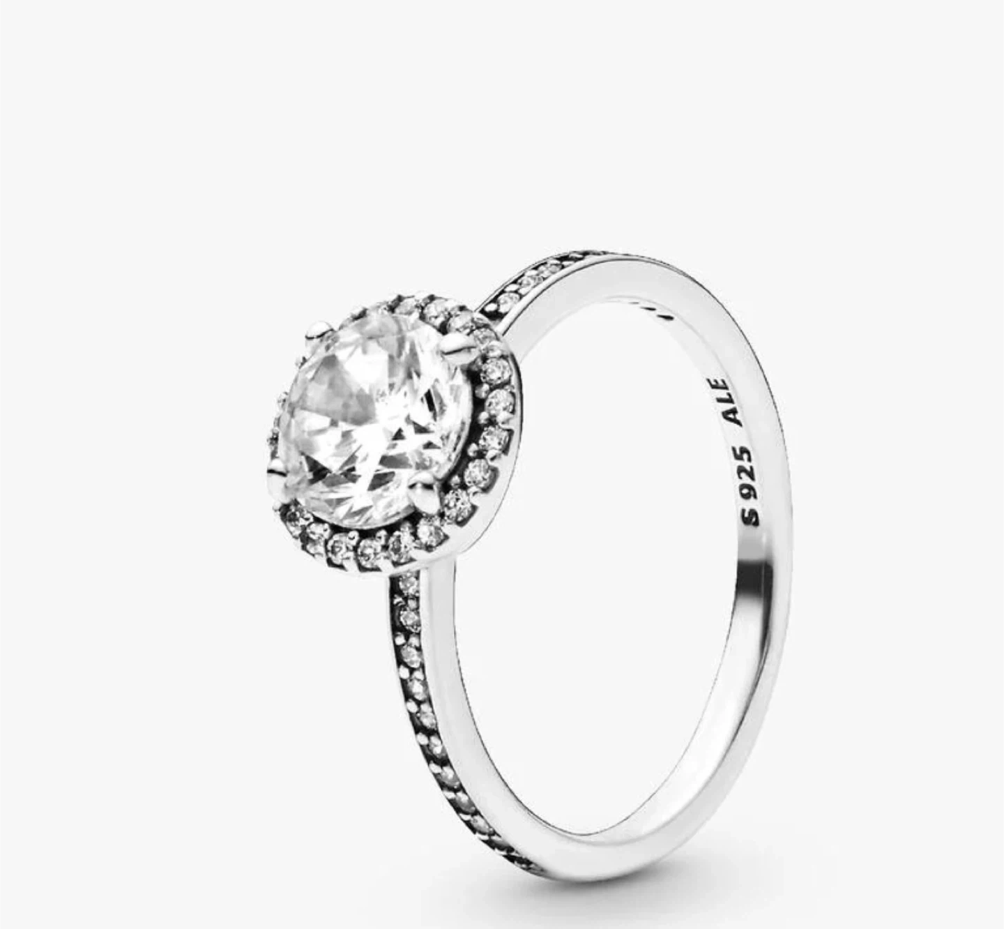 Pandora sterling silver ring featuring a round center stone surrounded by a halo of smaller stones. The band is also detailed with small stones. Includes original Pandora box.