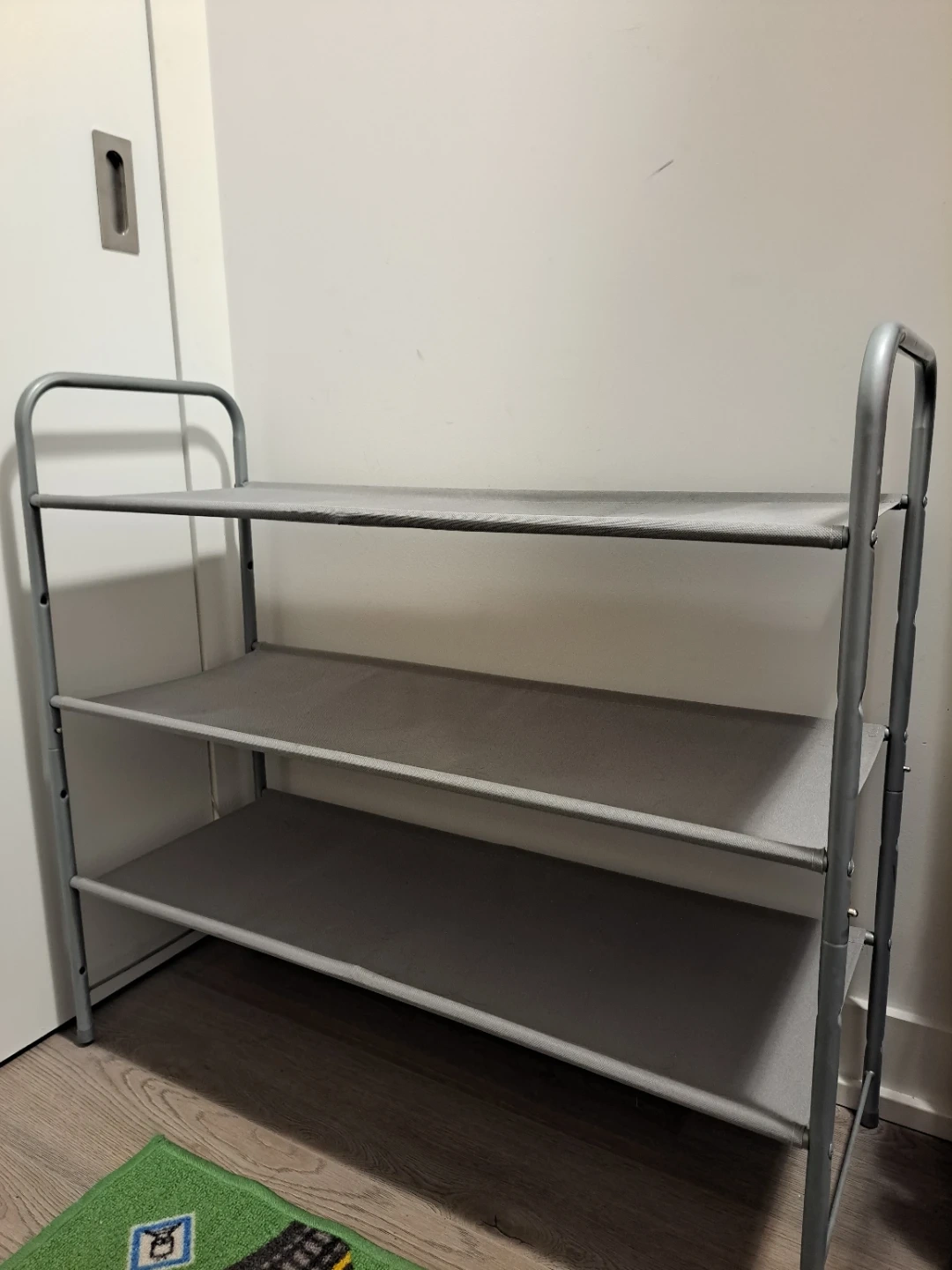 This is a 3-tier grey shoe rack. It's made with a metal frame and fabric shelves. It's a practical way to keep your shoes organized!