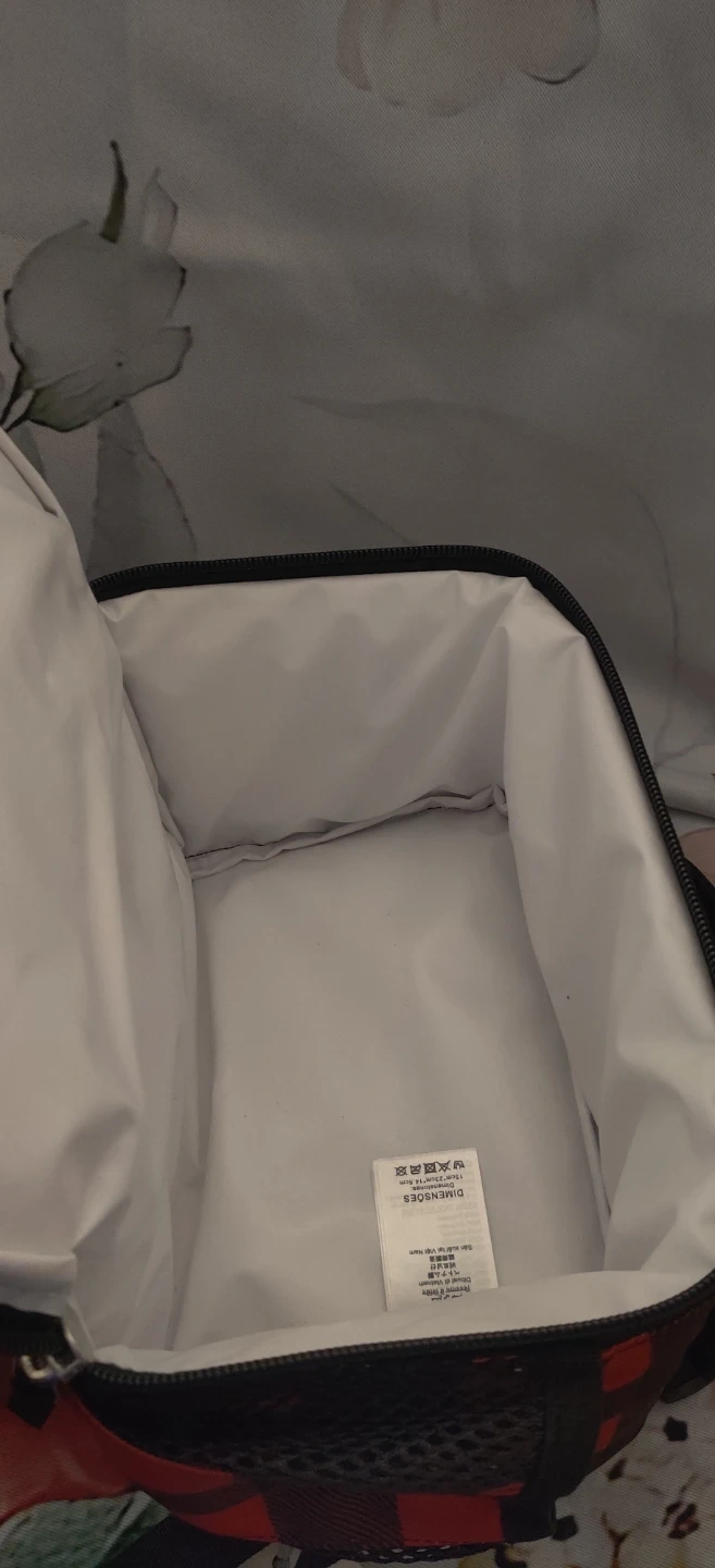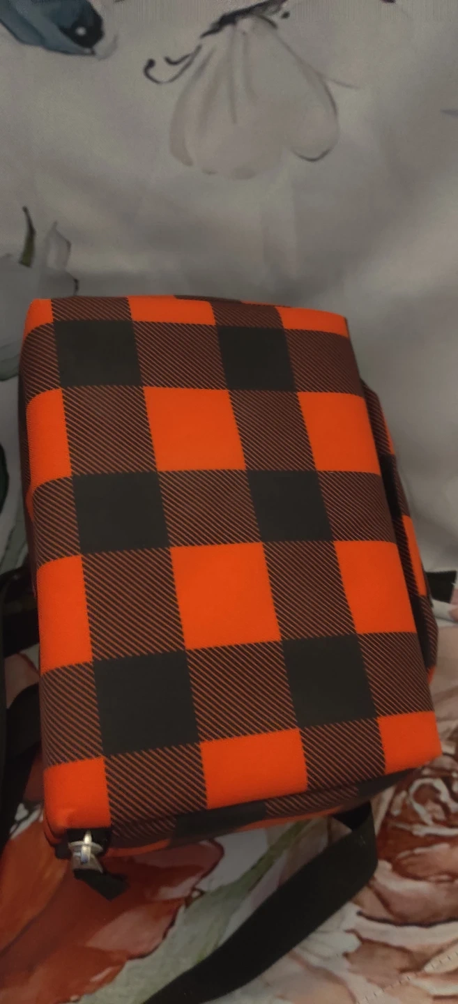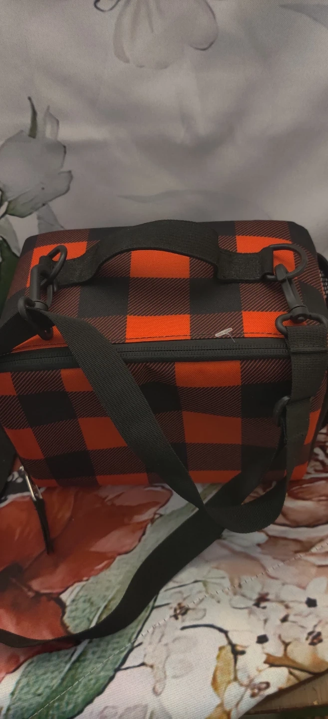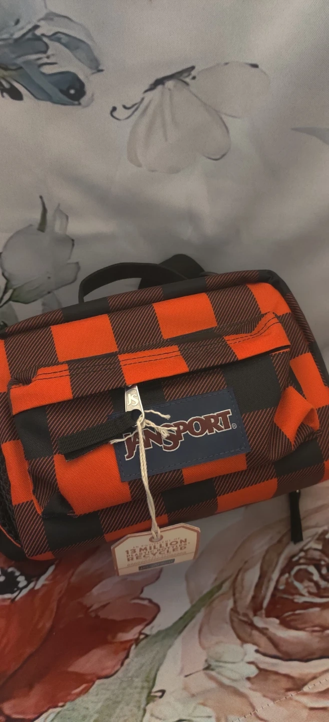 This is a Jansport lunch bag in a buffalo plaid pattern. It features a zippered main compartment and a top handle with an optional shoulder strap. Great for packing snacks or a lunch!10 inches wide