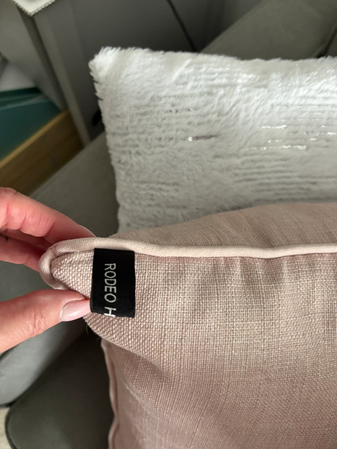 Two Rodeo Home decorative throw pillows in a soft pink hue. Pillow covers feature a subtle shimmer and piped edges. Zipper closure for easy removal.