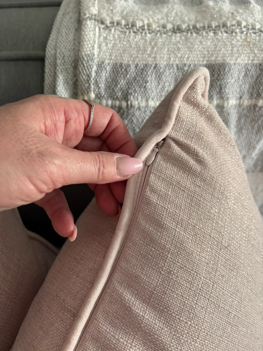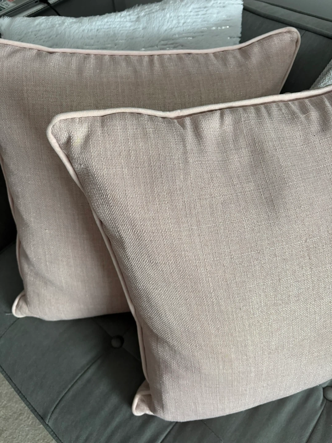 Two Rodeo Home decorative throw pillows in a soft pink hue. Pillow covers feature a subtle shimmer and piped edges. Zipper closure for easy removal.