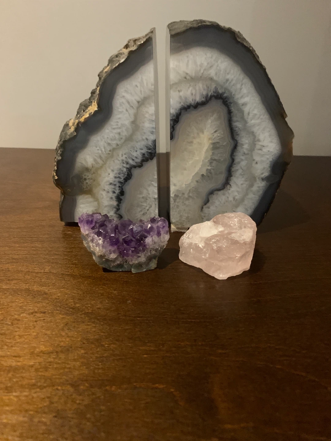 15Selling a set of agate bookends, perfect for adding a natural touch to your bookshelf or desk. They come with a couple of crystals as well! Separate: Crystals - $15 each Agate - $30