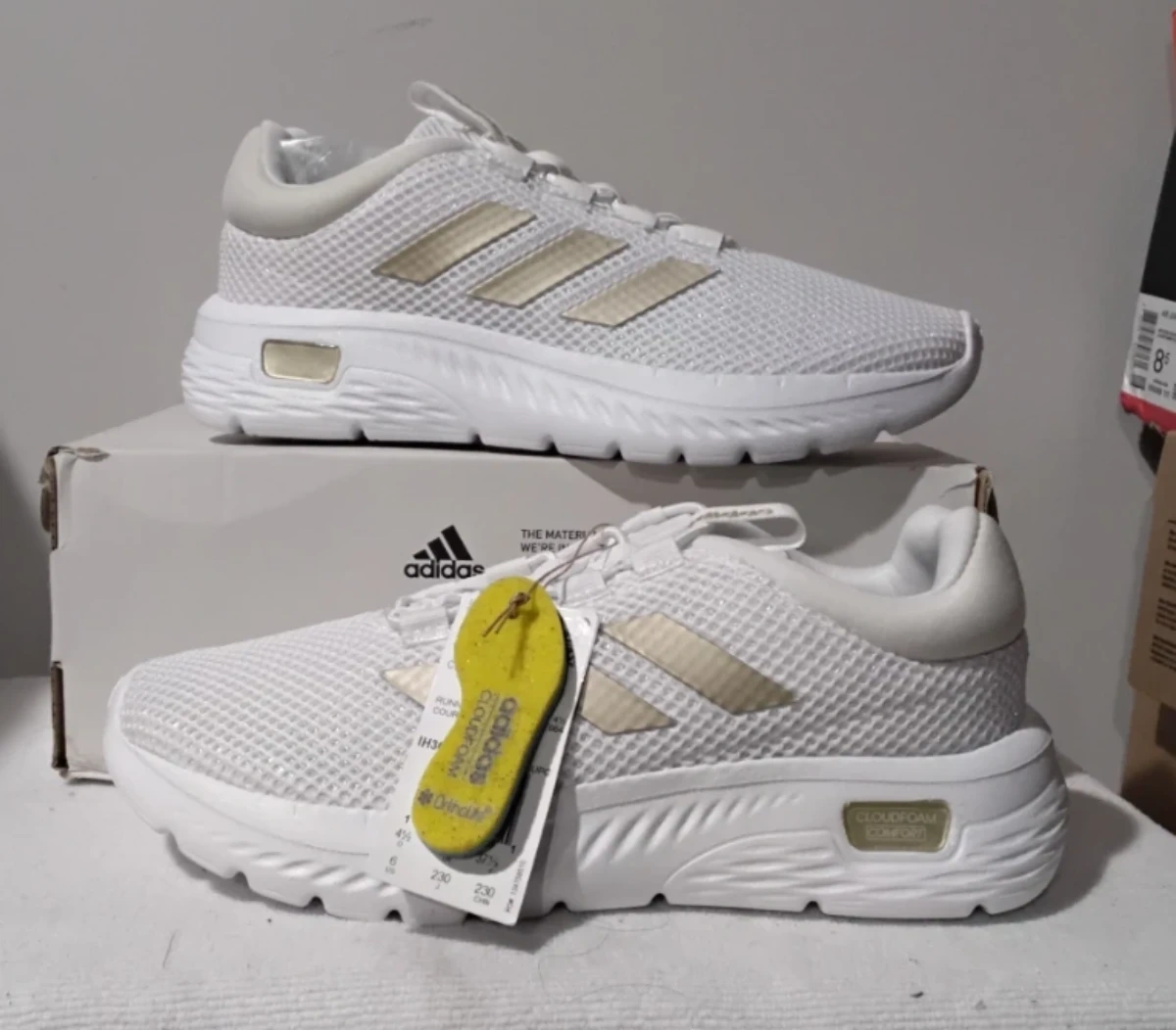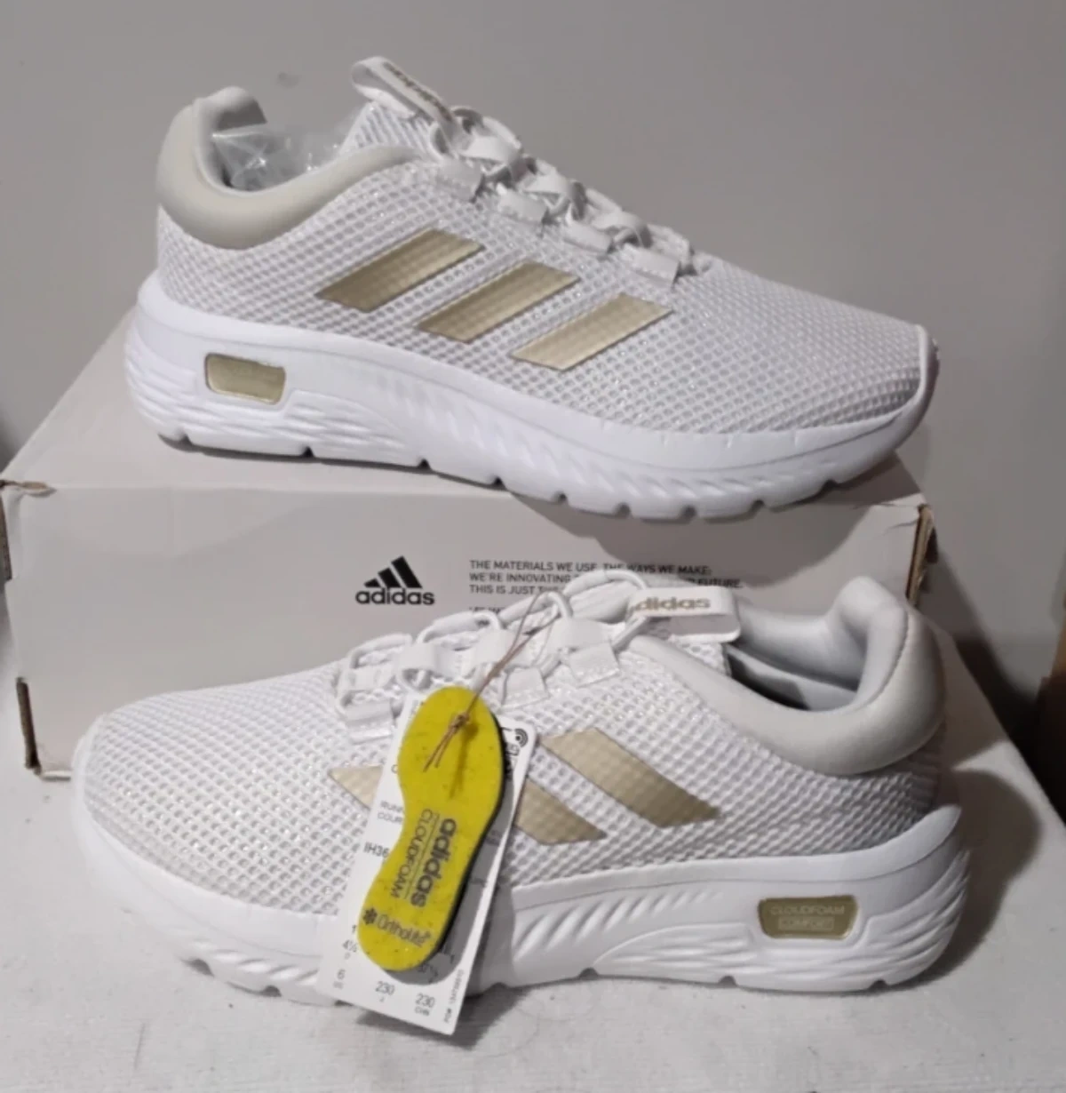 These are white Adidas running shoes with gold accents. They feature Cloudfoam cushioning for comfort. The materials used are breathable mesh. Perfect for your daily runs!