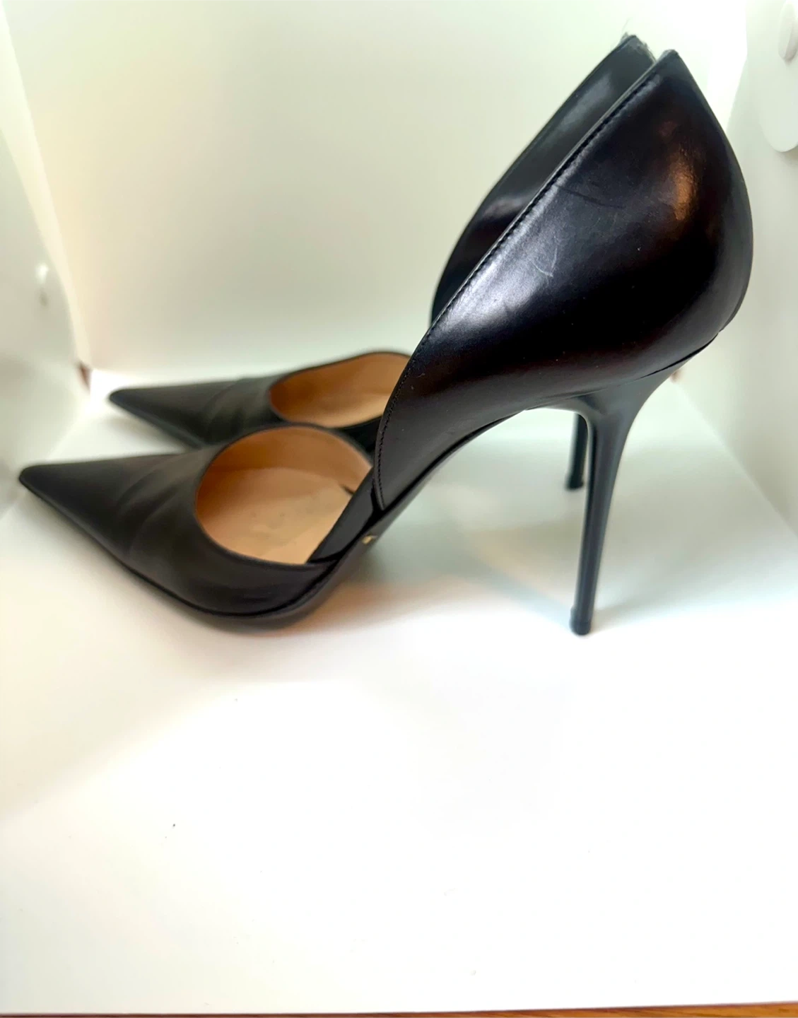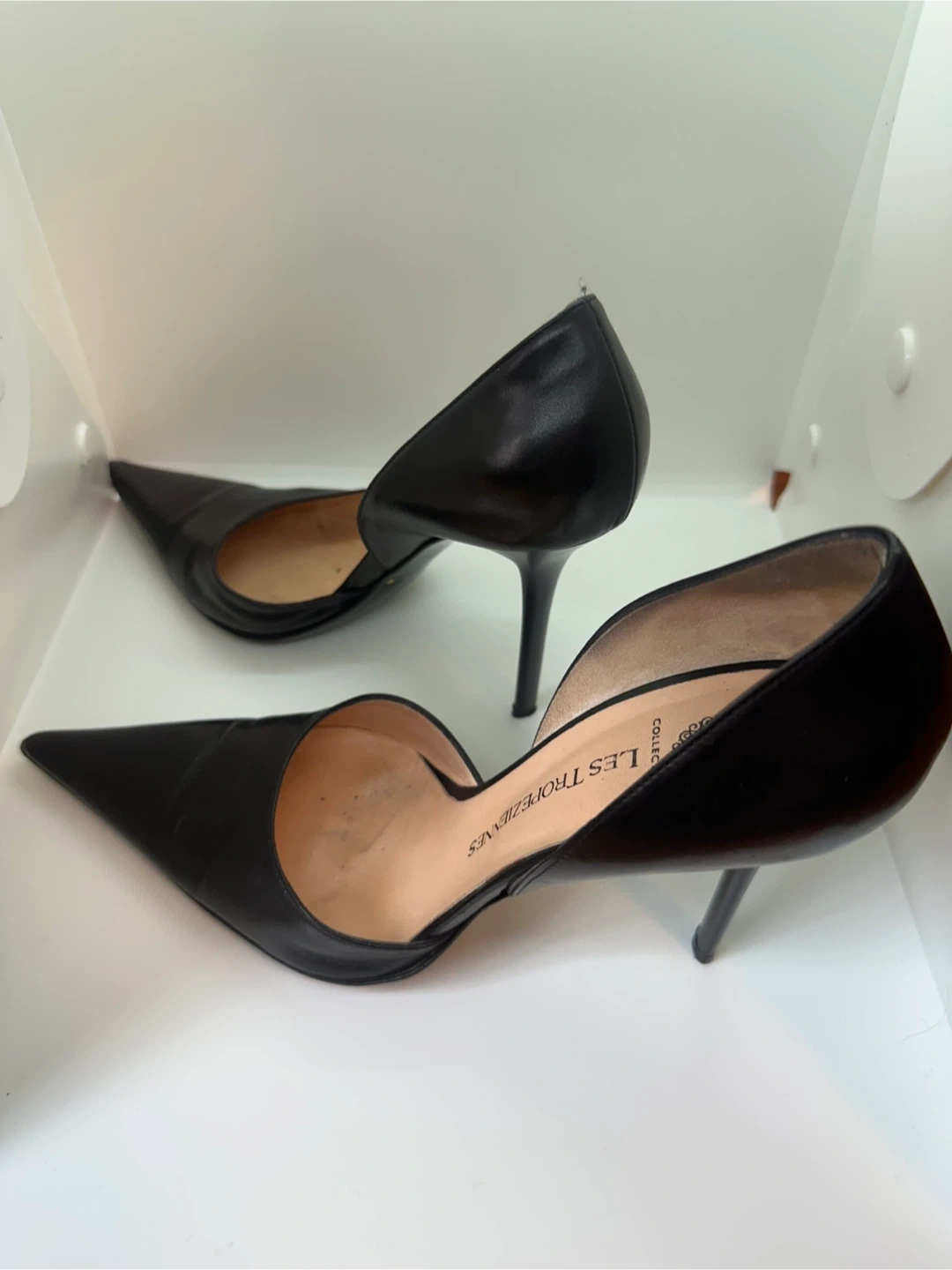 Elegant black leather D'Orsay heels by Les Tropeziennes. These pointed-toe pumps feature a stylish cut-out design and a stiletto heel. Made from genuine leather.