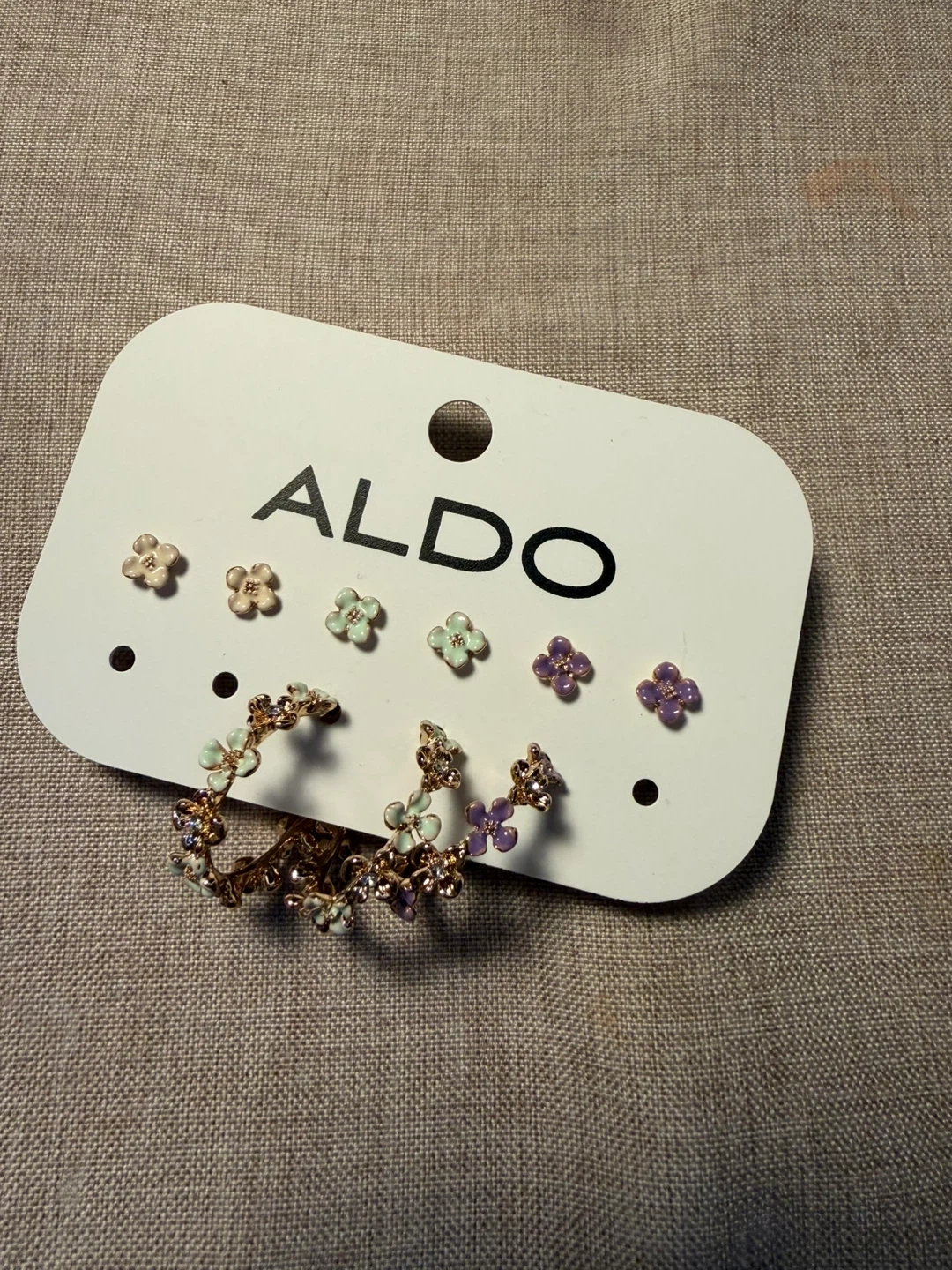 These earrings are from ALDO. It includes 1.5 pairs of hoops and 3 pairs of stud earrings. The earrings are decorated with small floral designs in white, mint green, and purple.