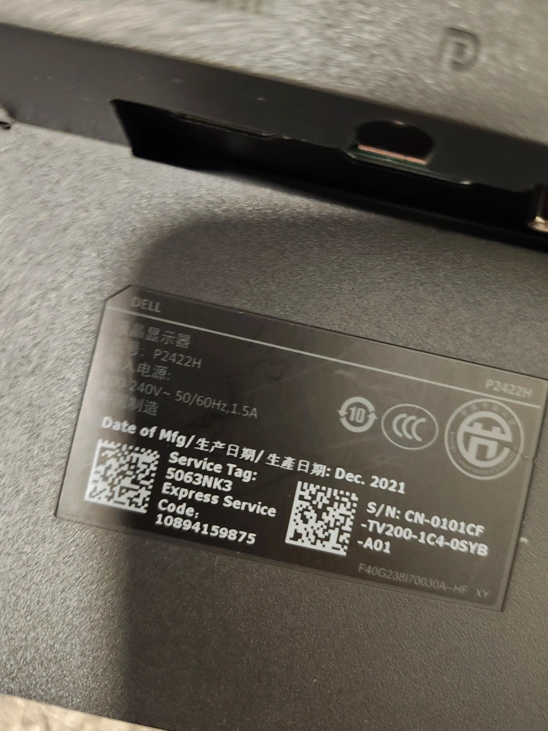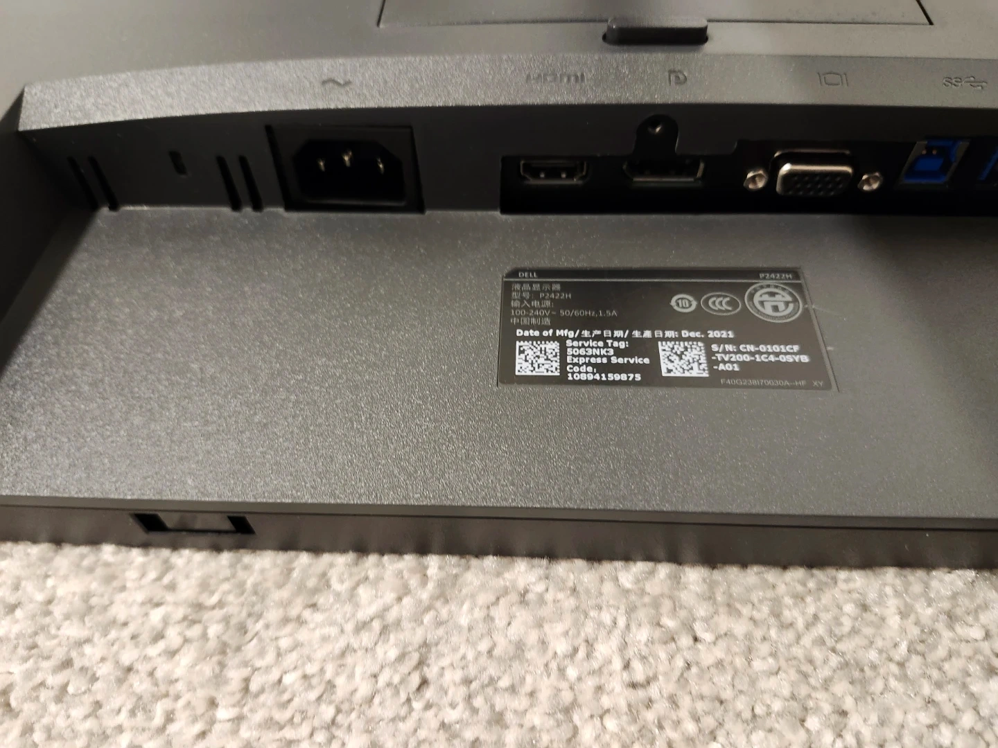 Dell P2422H LCD monitor with a 2021 manufacturing date. Input voltage is 100-240V~50/60Hz, 1.5A. It comes with a power cable and features HDMI and VGA ports. Great for office or home use!