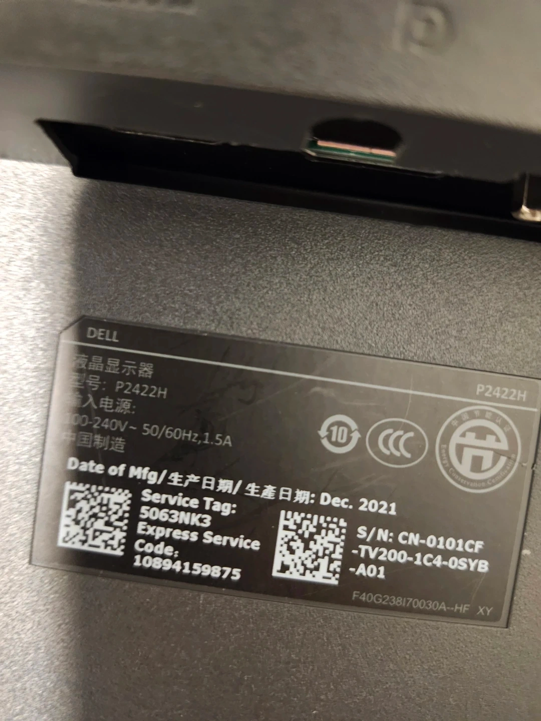 Dell P2422H LCD monitor with a 2021 manufacturing date. Input voltage is 100-240V~50/60Hz, 1.5A. It comes with a power cable and features HDMI and VGA ports. Great for office or home use!