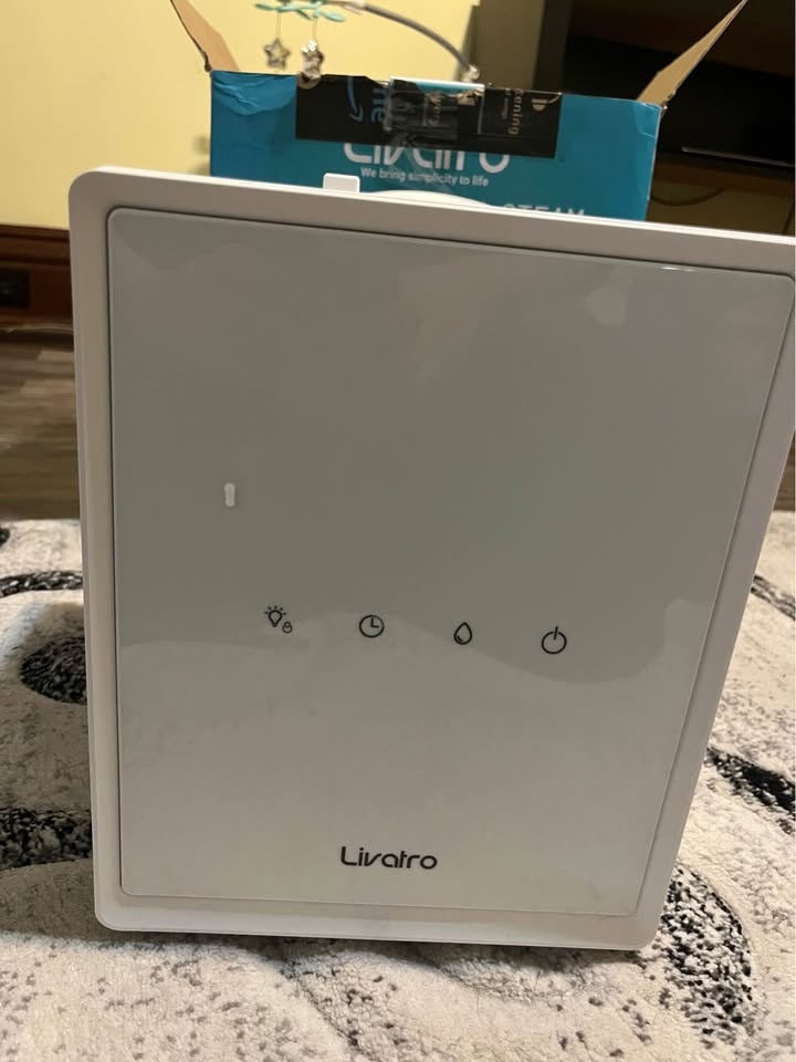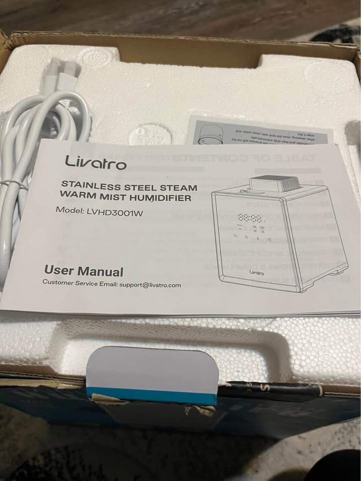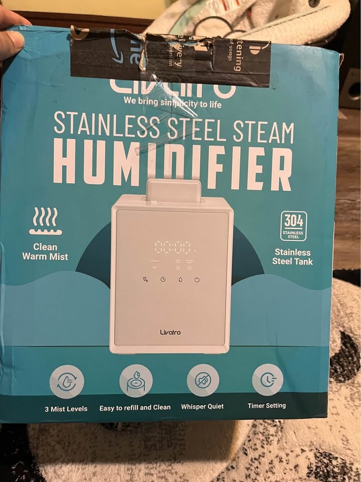 Brand new Livatro humidifier in white. Features a stainless steel water tank for healthy and clean steam mist. It has an auto-clean function and auto shut-off. Capacity is 3 Liters, covering up to 300 square inches. This warm mist humidifier heats water to a boiling point for pure steam, ideal for dry skin and congestion. The stainless steel tank is easy to clean and dishwasher safe. Safety features include auto-off for low water, child lock, and screen lock. It has adjustable humidity settings (High, Low, Sleep modes) and offers 6-12 hours of continuous mist. The auto-clean mode helps with limescale removal. Let me know if you're interested!