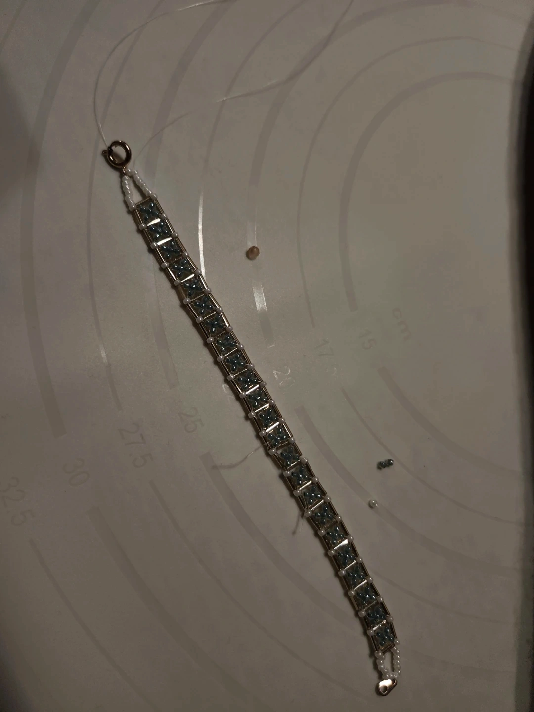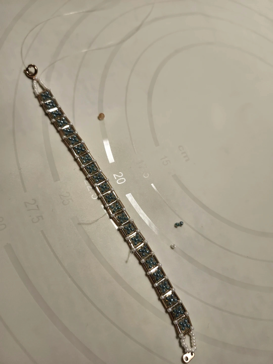This is a handmade bracelet featuring small, square teal beads with white accents. It has a simple clasp for easy fastening. It's a delicate piece that adds a touch of colour to any outfit. This bracelet would be lovely for everyday wear.