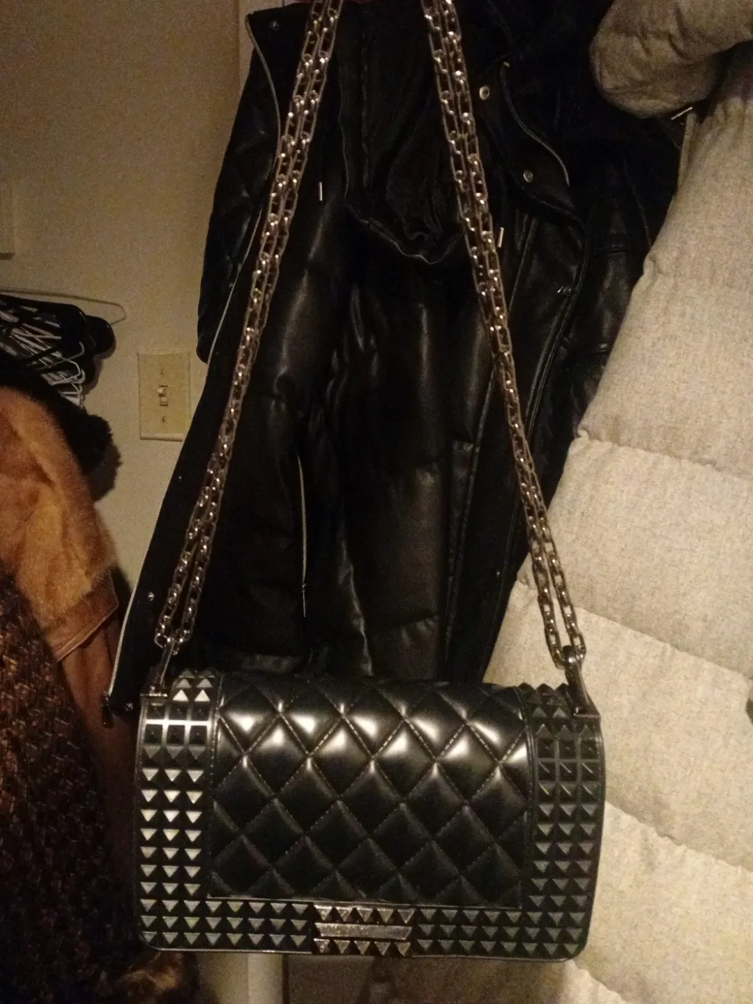 This stylish black quilted bag features silver stud accents on the sides and front flap. It has a long silver chain strap for comfortable wear. It's perfect for adding a bit of edge to an evening outfit!