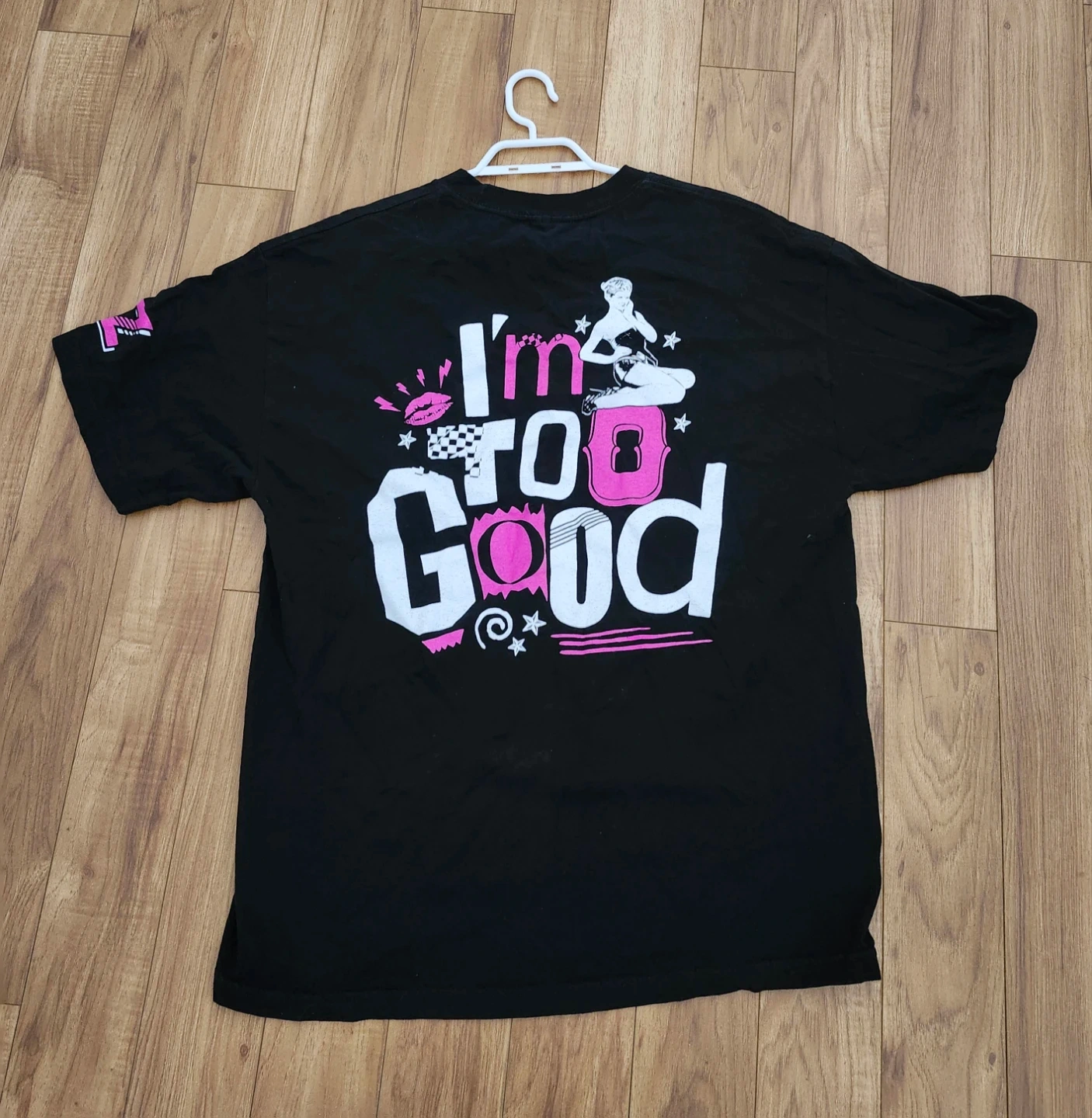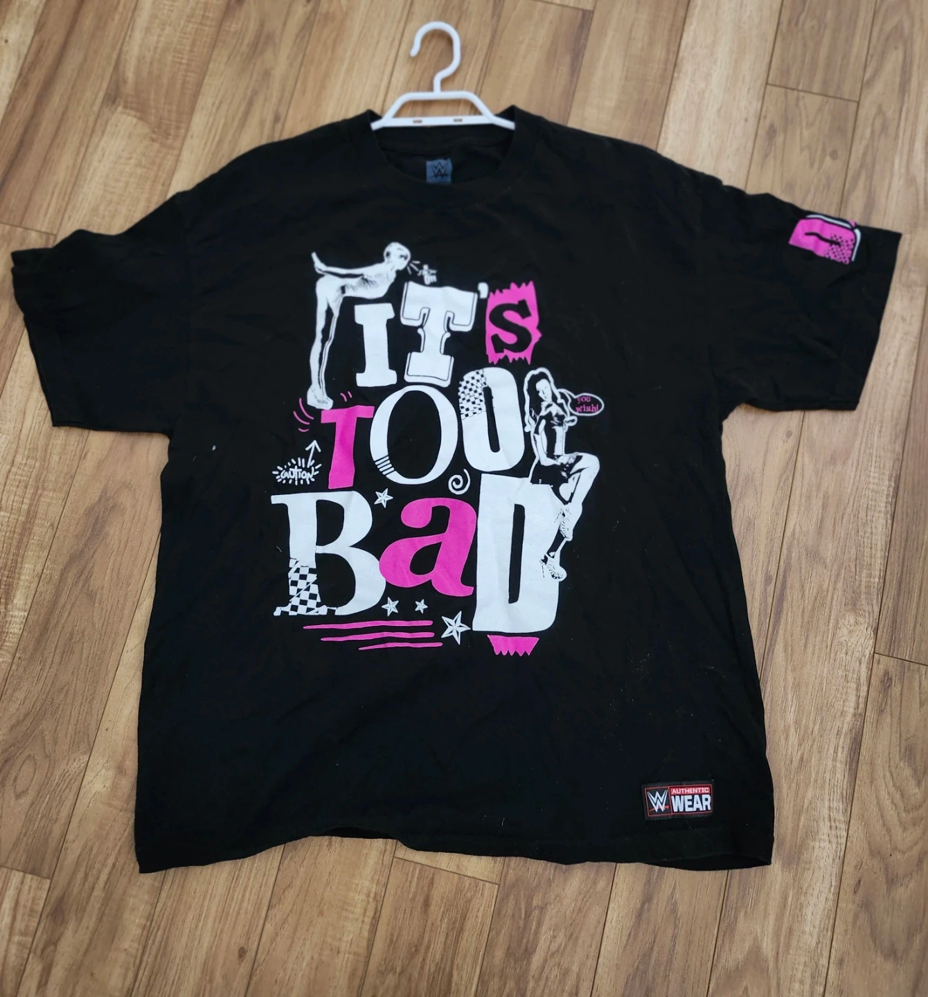 Black WWE Wear t-shirt with 'It's Too Bad' graphic on the front and 'I'm Too Good' graphic on the back. Cotton material.