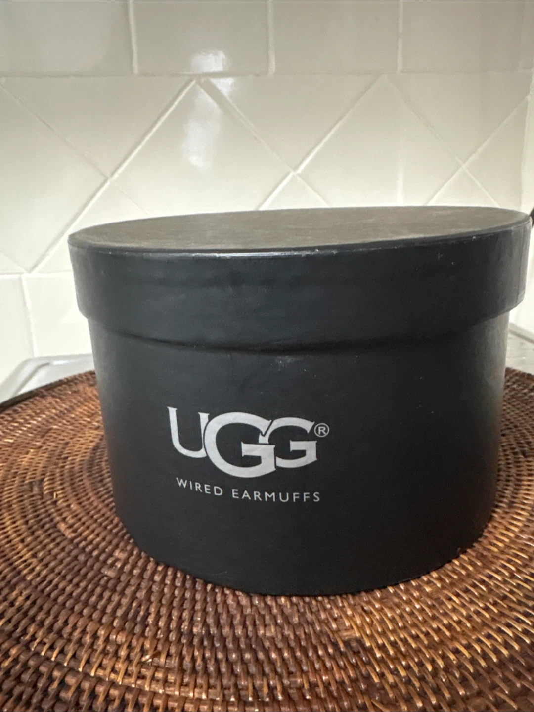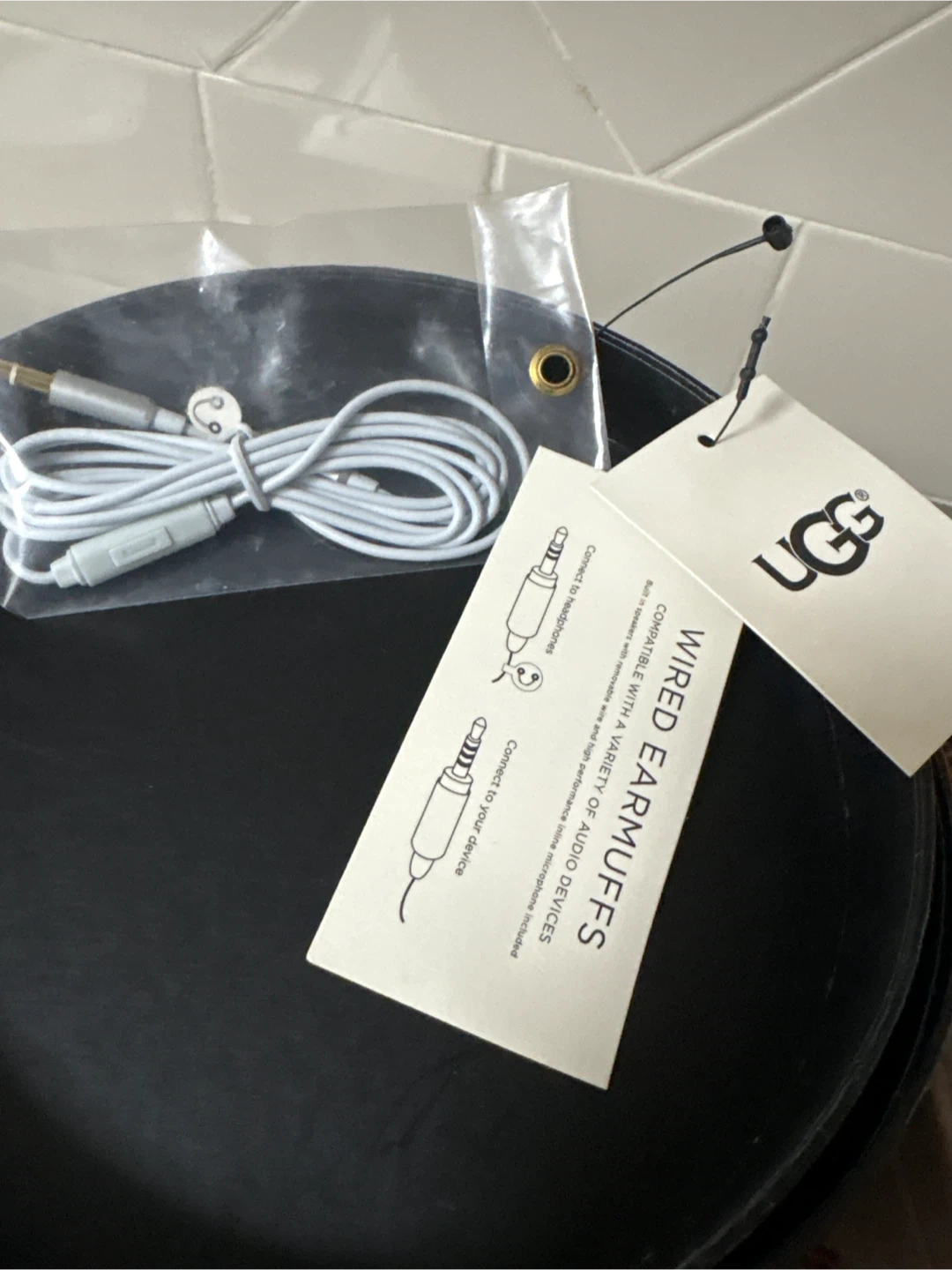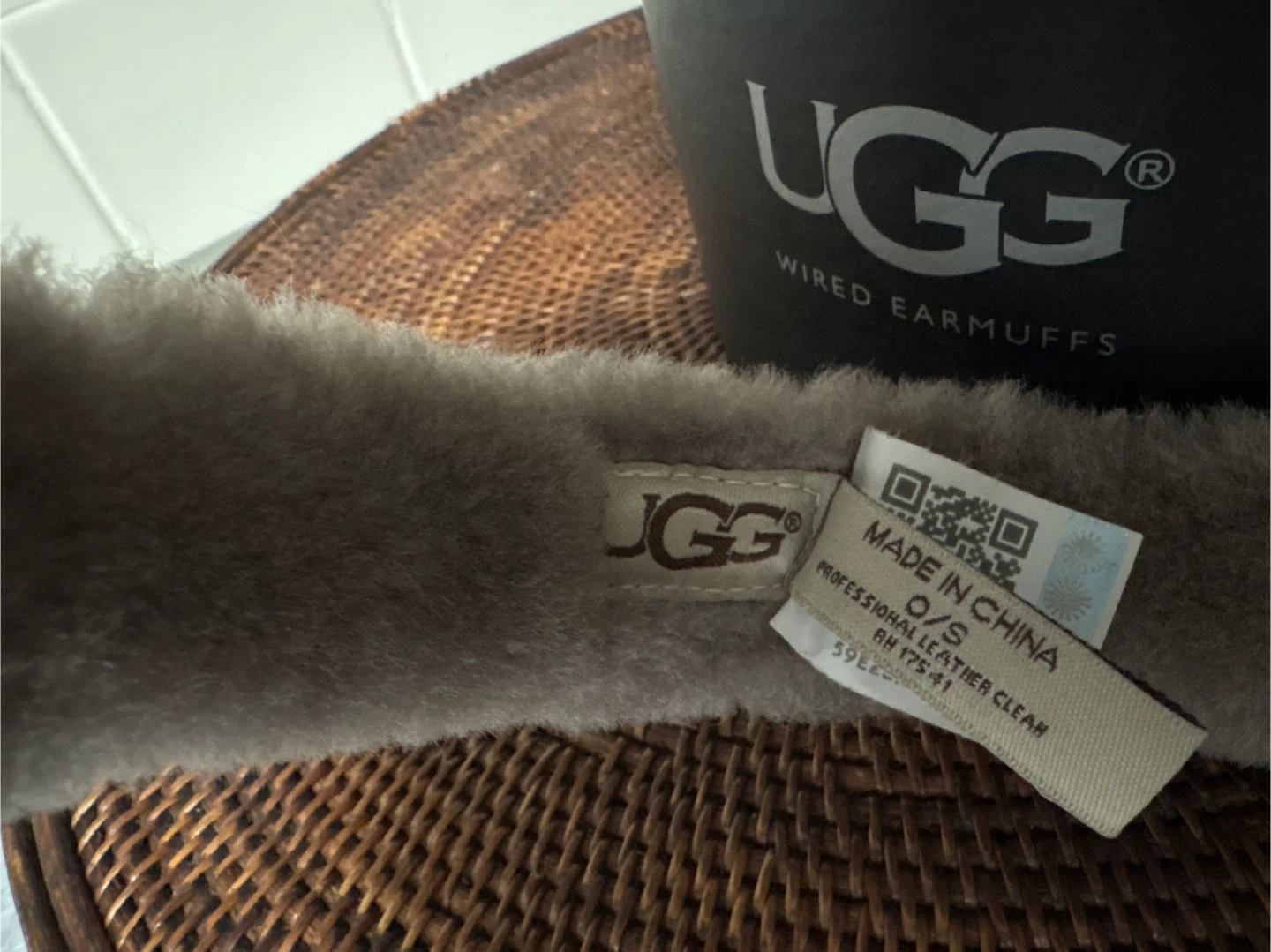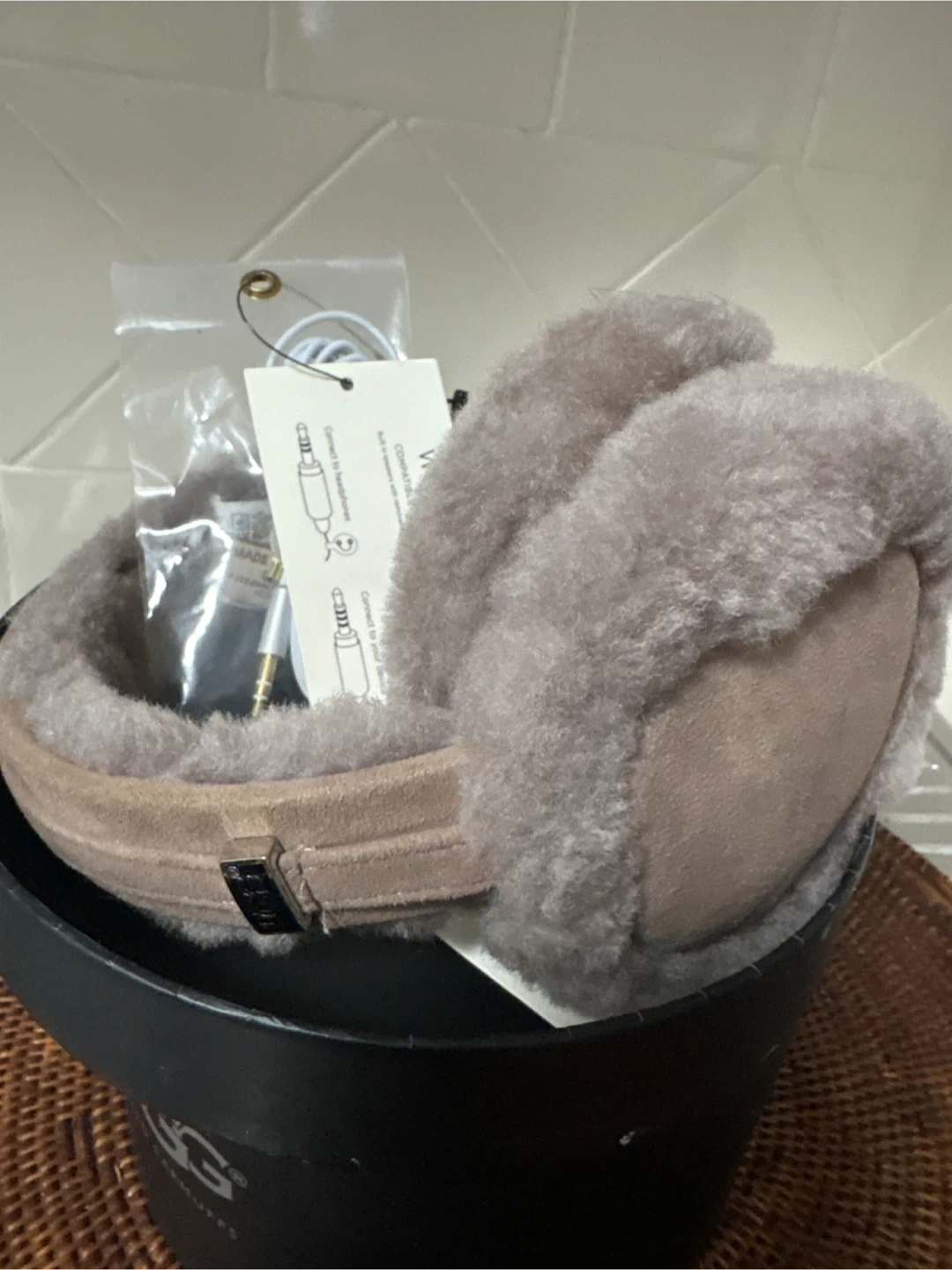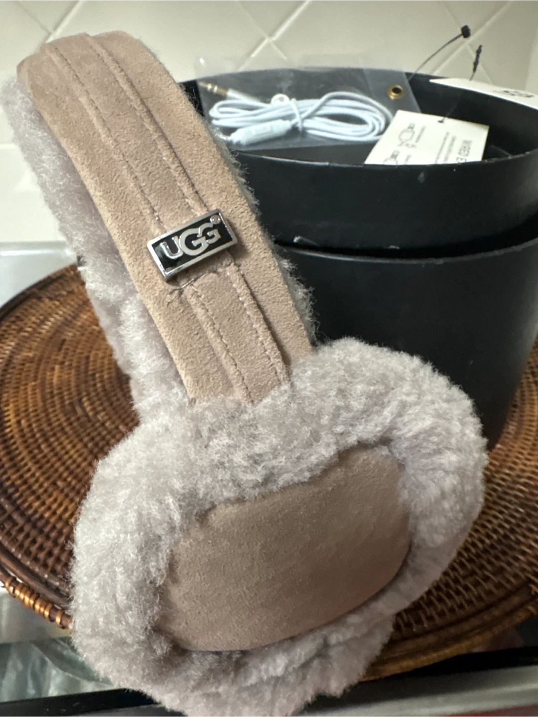 UGG wired earmuffs in light grey. Includes original box and audio cable. Compatible with a variety of audio devices. Self-insulation with luxurious shearling.