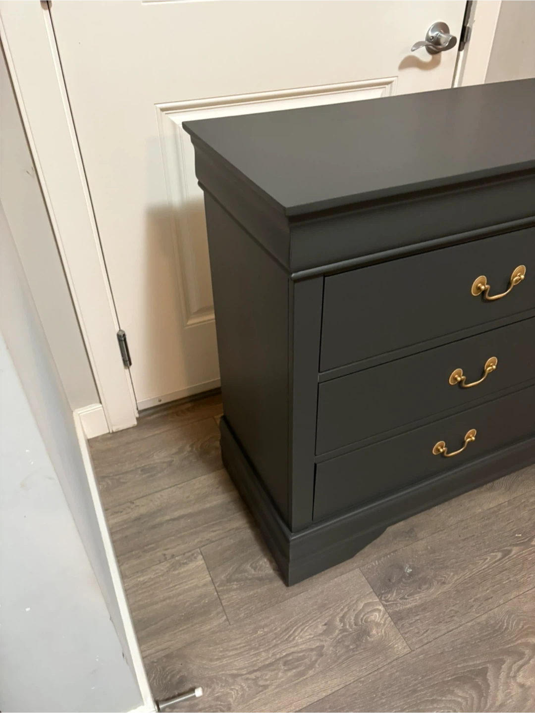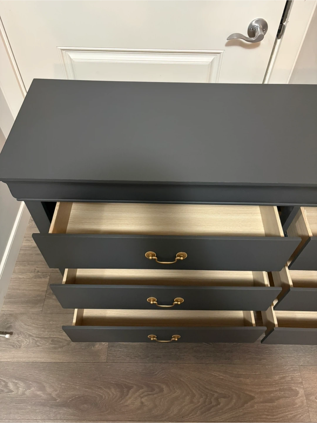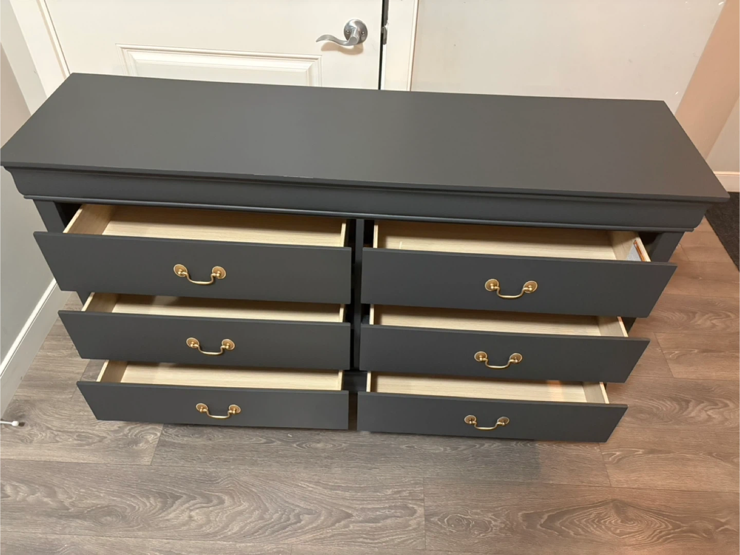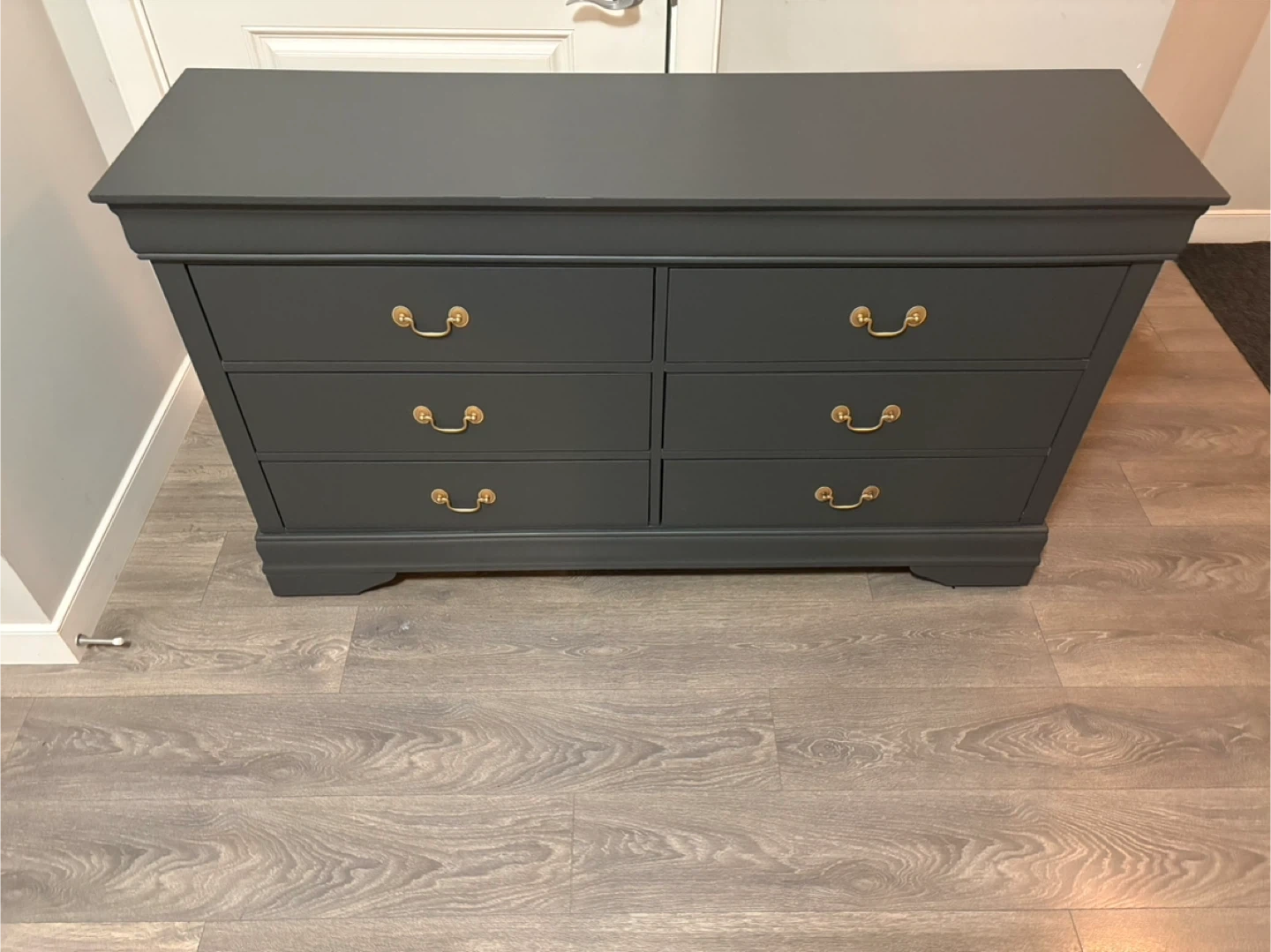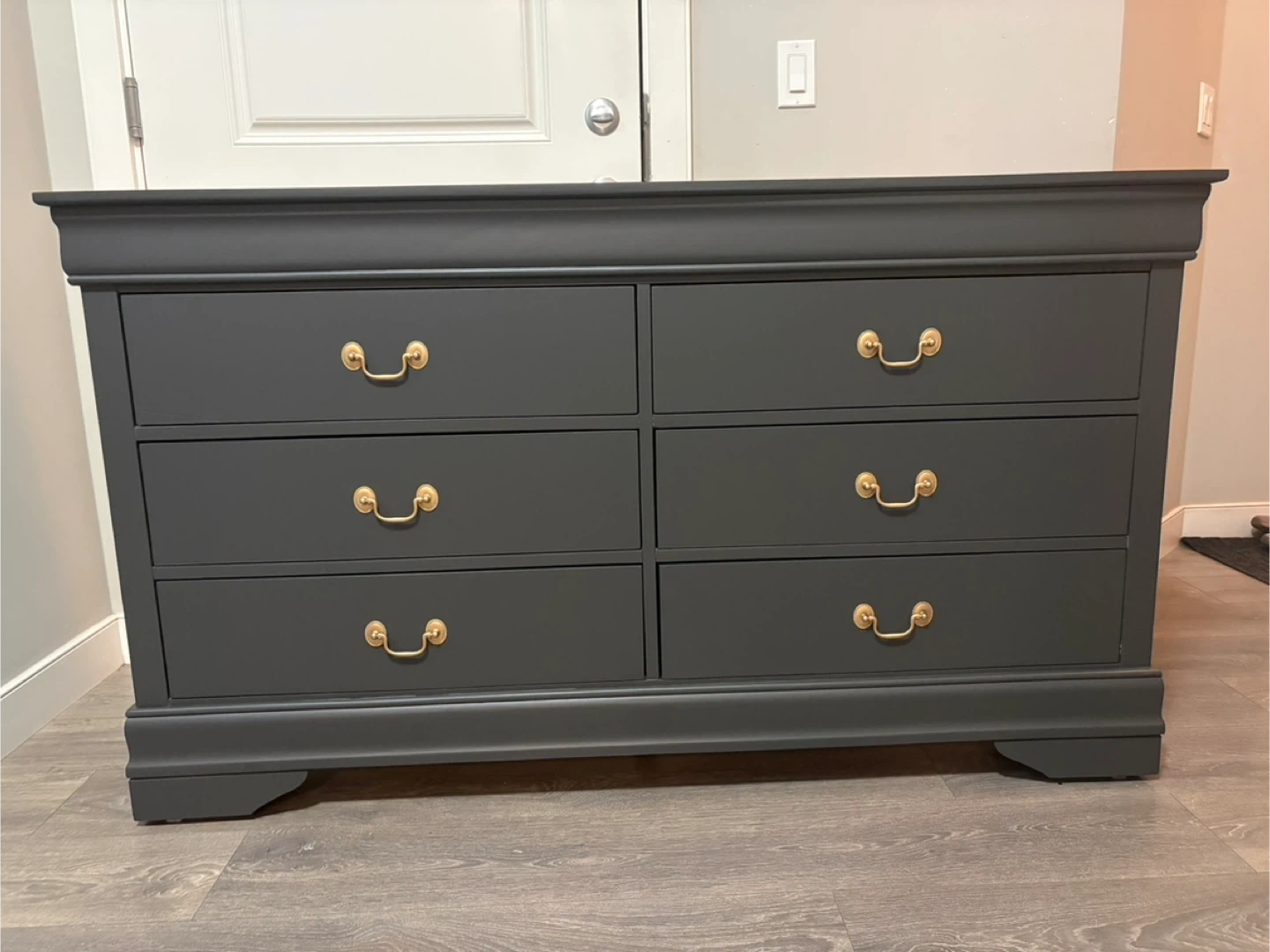 This stylish 6-drawer dresser is perfect for adding storage and a touch of elegance to any bedroom. The dresser has been refinished in a modern iron ore (dark grey) with gold hardware, making it a standout piece. Its spacious drawers offer ample room for clothes and accessories.