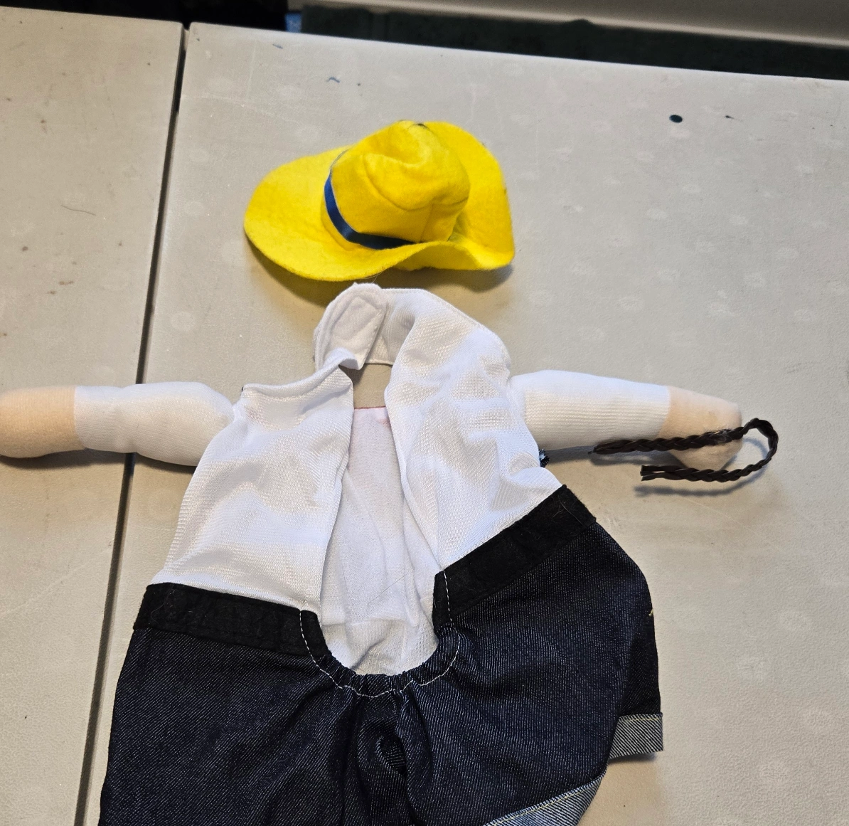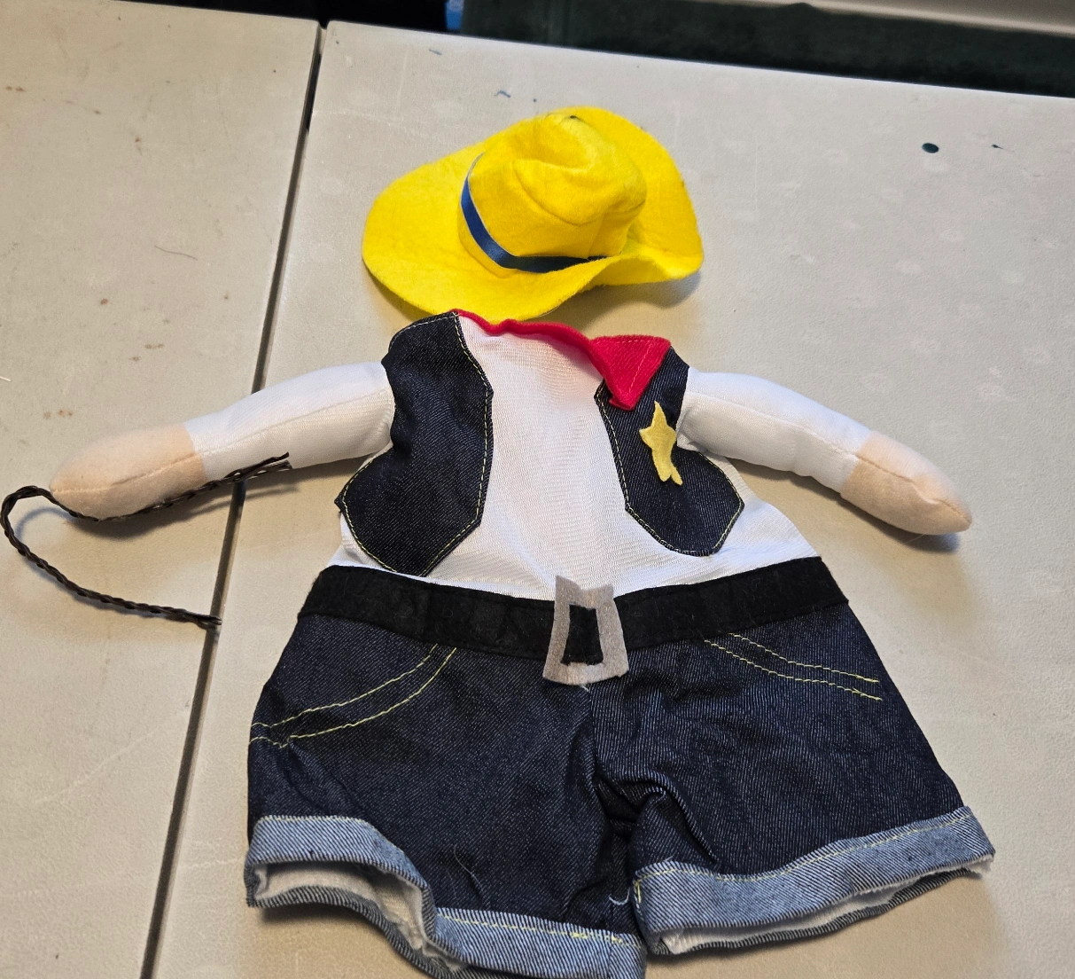 Howdy partners! I'm selling a cute little cowboy outfit for a your furbaby. It includes a yellow cowboy hat with a blue band, a denim-look vest, and matching shorts. Perfect for dressing up your favourite furbaby for some rootin' tootin' fun for Halloween..pick up SE flats
