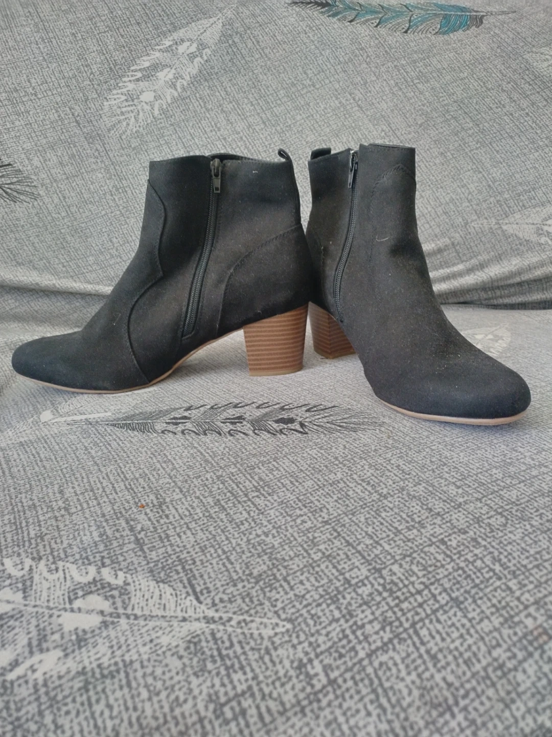 Classic black ankle boots with a faux suede finish. They're designed with a side zipper for easy on and off and feature a stacked heel. These boots are great for adding a touch of style to any outfit, whether it's for work or a night out!
