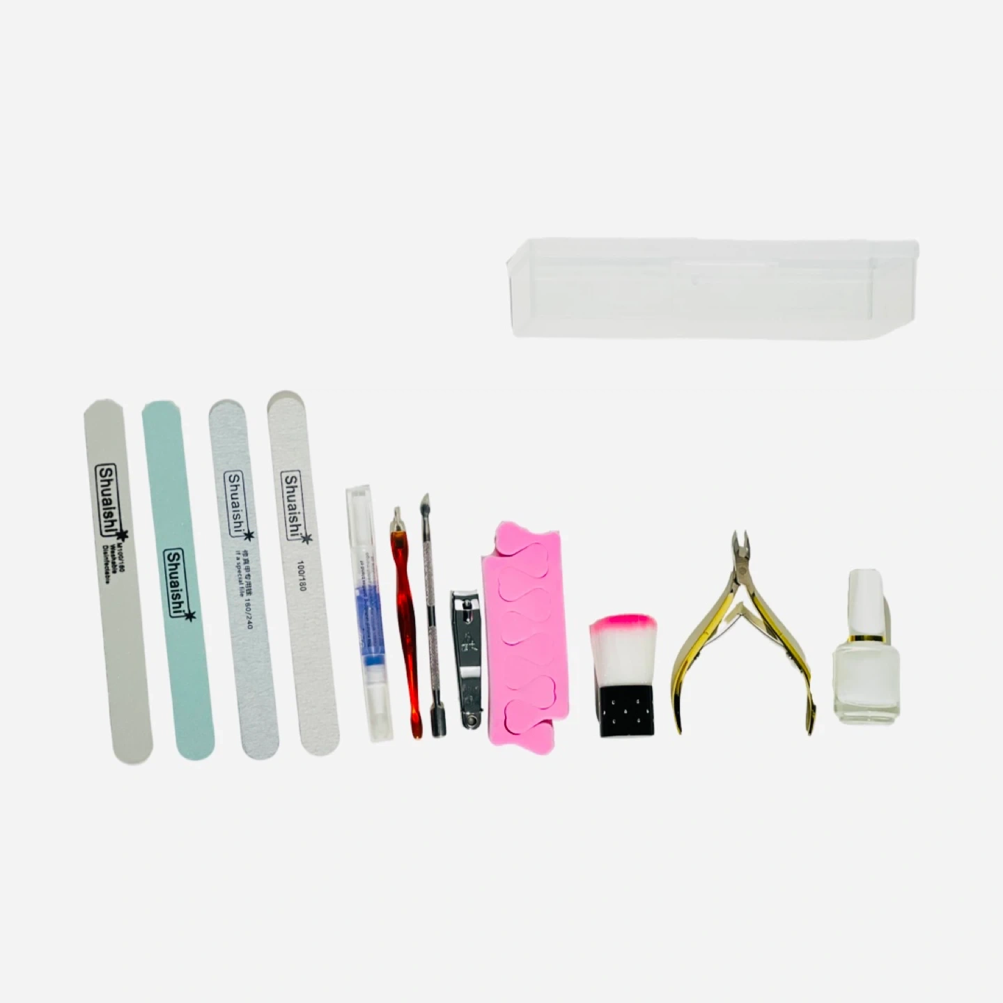 100% new! This manicure kit includes several files, cuticle pusher, cuticle clipper, nail clipper, cuticle remover pen, toe separators, a brush, a manicure cream and a cuticle oil. It comes with a manicure case!