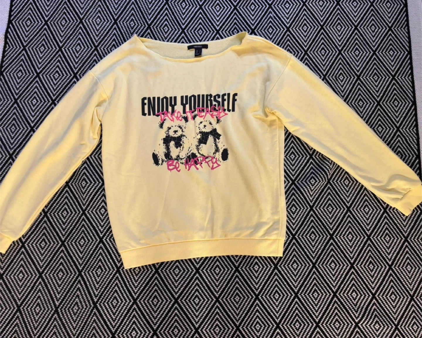 This light yellow crewneck sweatshirt features a playful graphic with pandas and the text 'Enjoy Yourself'. It's a cozy and stylish piece. The material is a soft blend, perfect for casual wear.