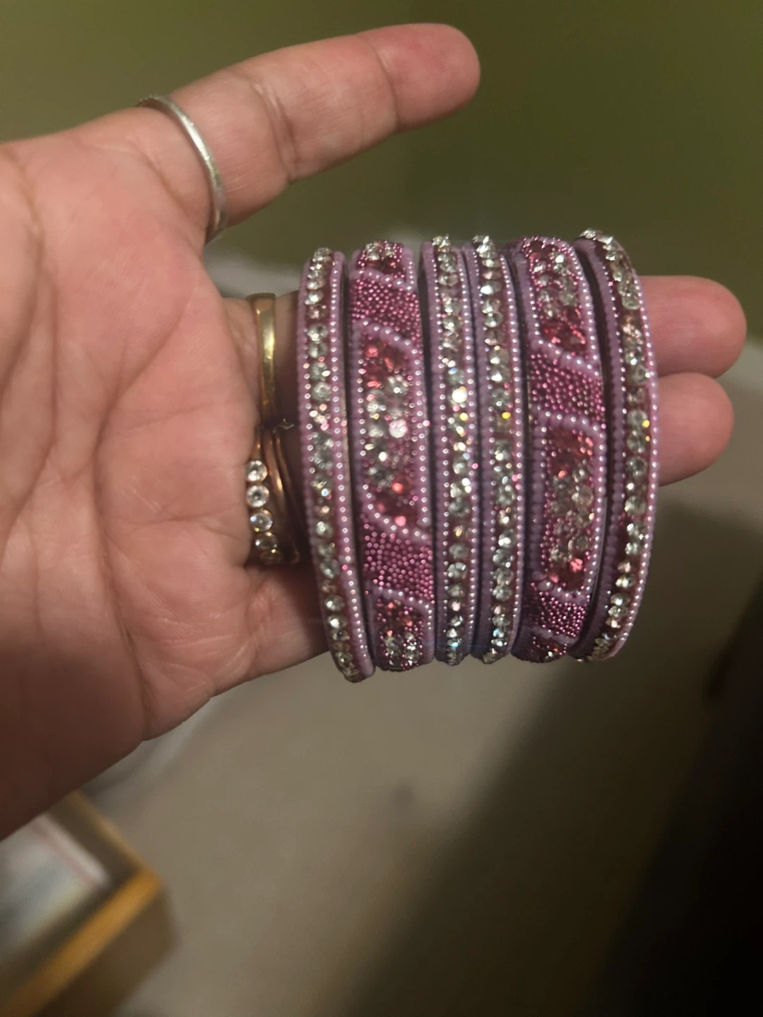 This set includes six bangles, each adorned with pink beads and sparkling silver-toned embellishments. They feature intricate patterns with a mix of small pink beads and clear rhinestones. These bangles are great for adding a touch of sparkle to any outfit!