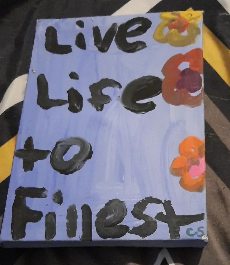 This is a hand-painted canvas with the phrase "Live Life to Fullest" and floral accents. It's painted in black lettering on a light blue background. The artist's initials "C.S." are visible in the bottom right corner. This piece would brighten any wall!