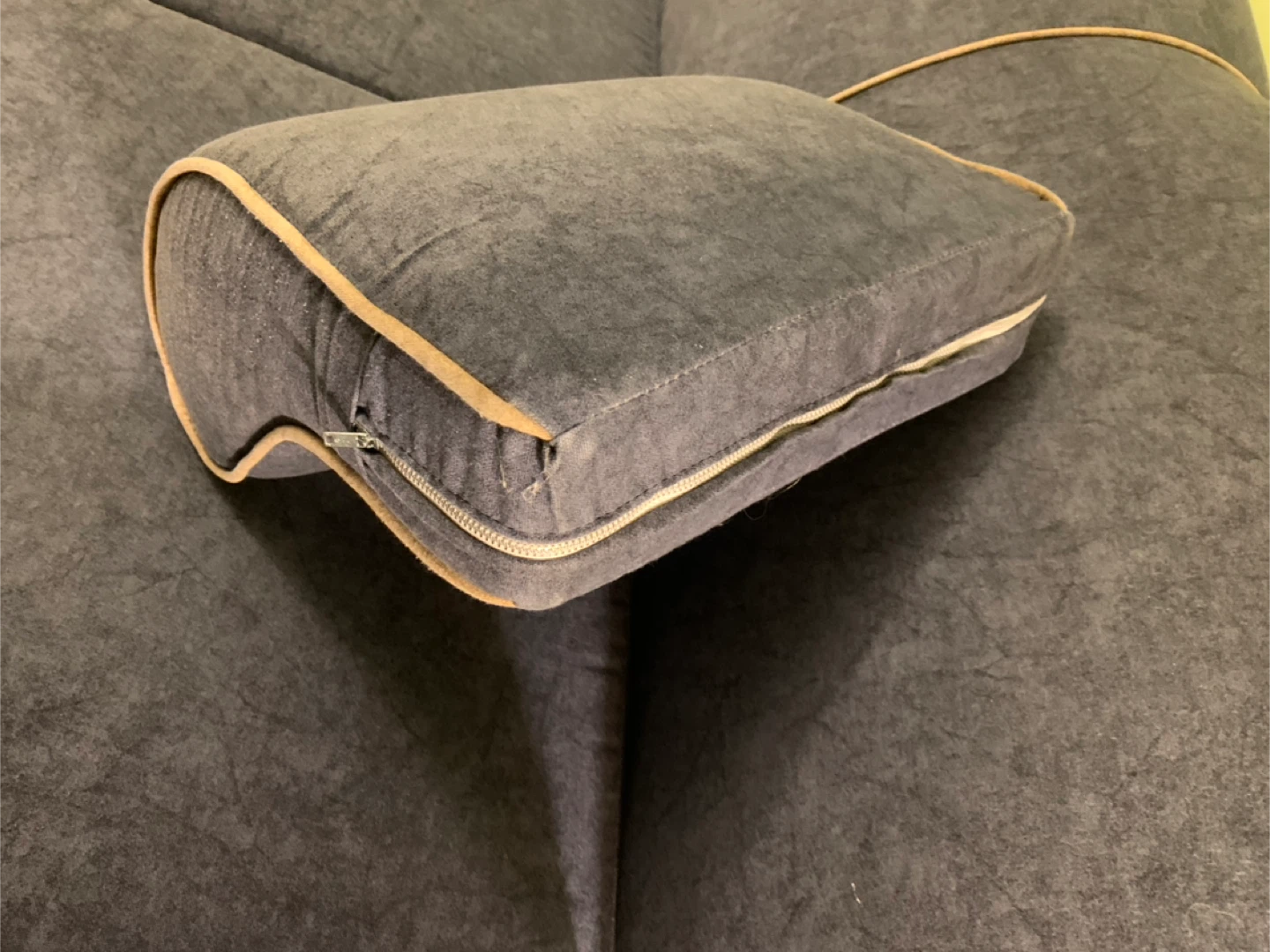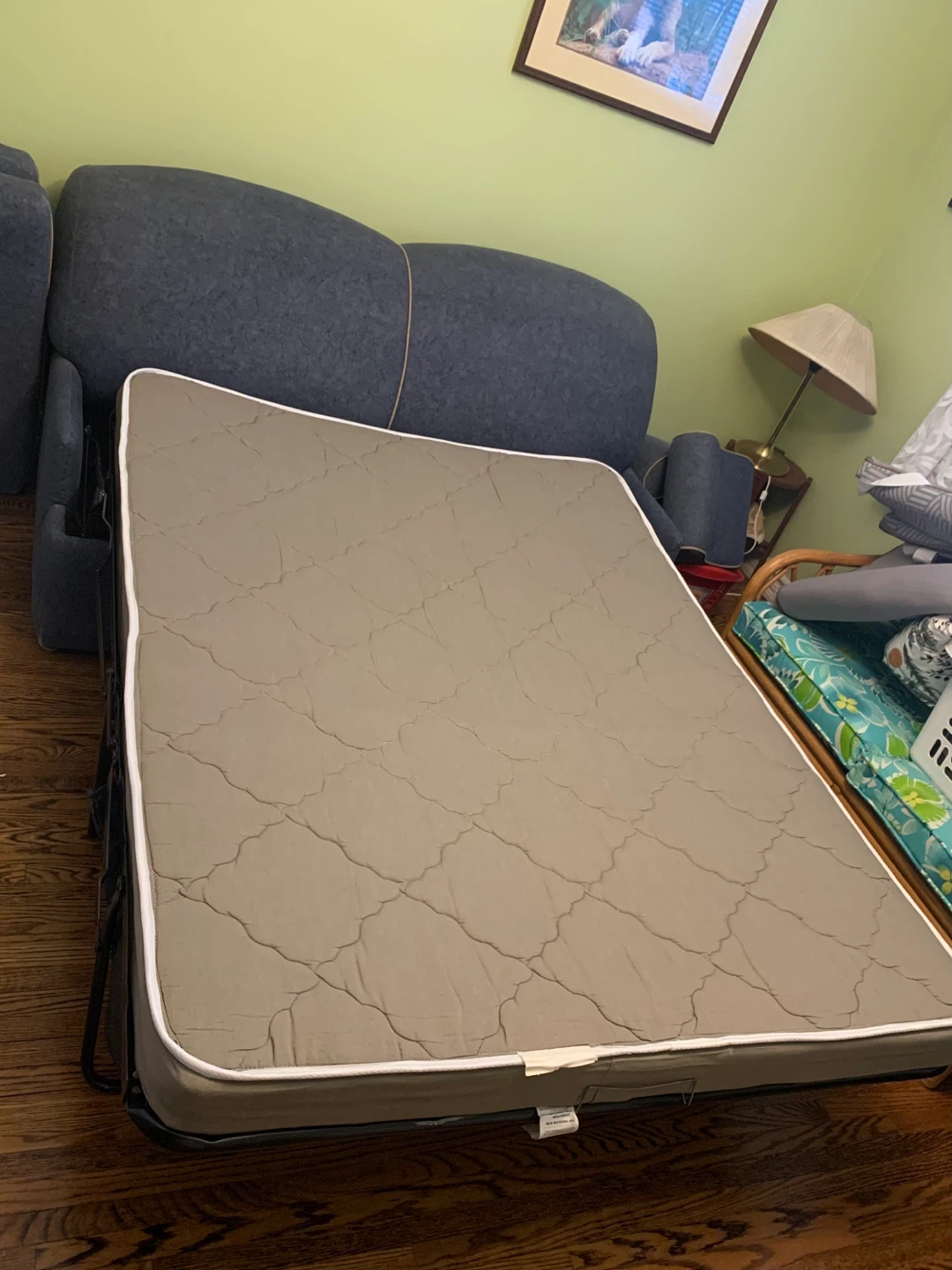 Blue-gray loveseat with easy in-out foam cushions ( zipper covers) , in very good condition. Pulls out to double bed, and includes nearly new 1-1/2 in thick high density foam mattress topper. Clean, comfortable, in perfect working condition. Help with delivery possible subject to extra charge