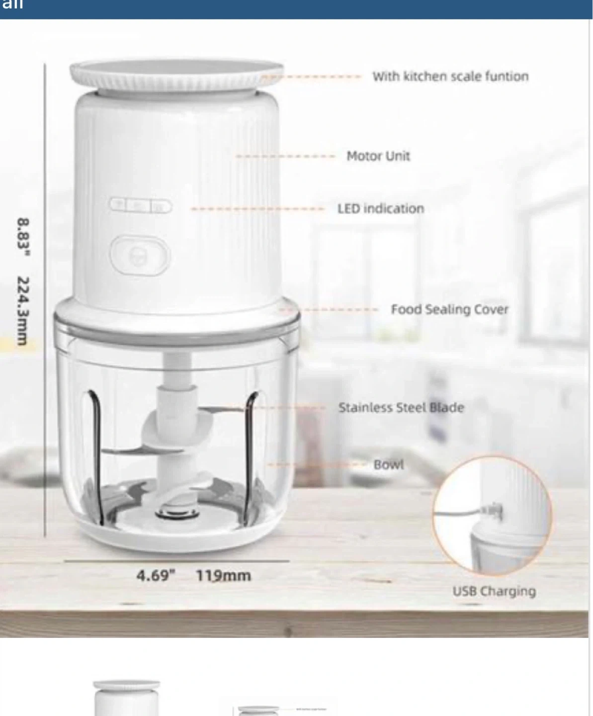 This compact electric food chopper features a stainless steel blade and USB charging. It also has a built-in kitchen scale function for precise measurements. Perfect for quickly mincing garlic, herbs, and other ingredients.