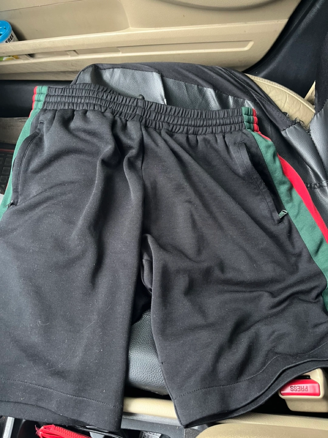 Selling a pair of Gucci black shorts in size medium. These shorts feature the classic Gucci stripe detail. They are in good condition and ready for a new home!