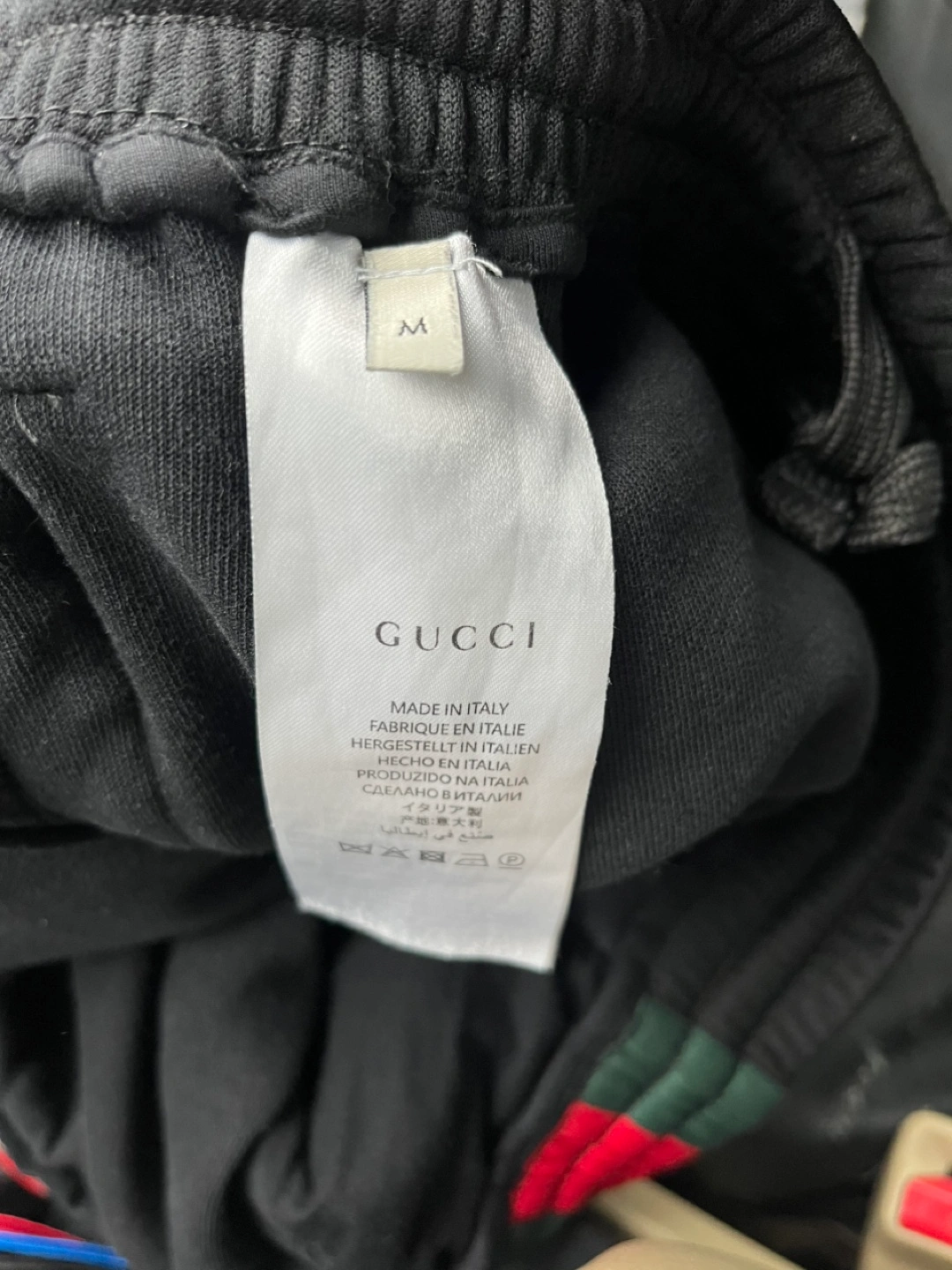 Selling a pair of Gucci black shorts in size medium. These shorts feature the classic Gucci stripe detail. They are in good condition and ready for a new home!