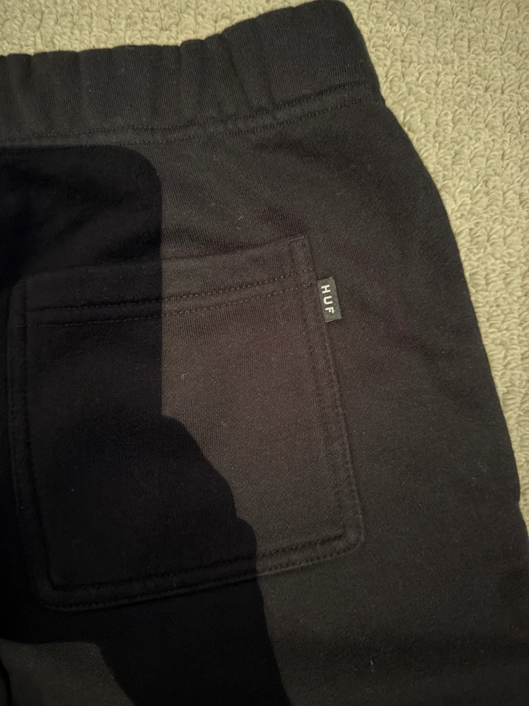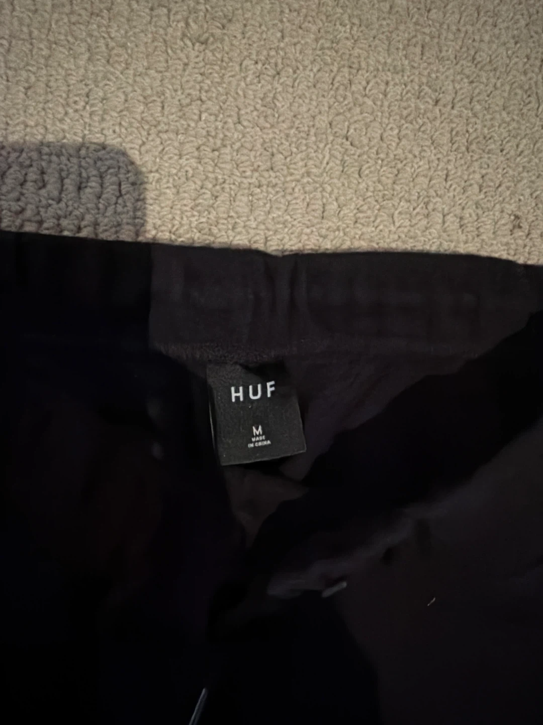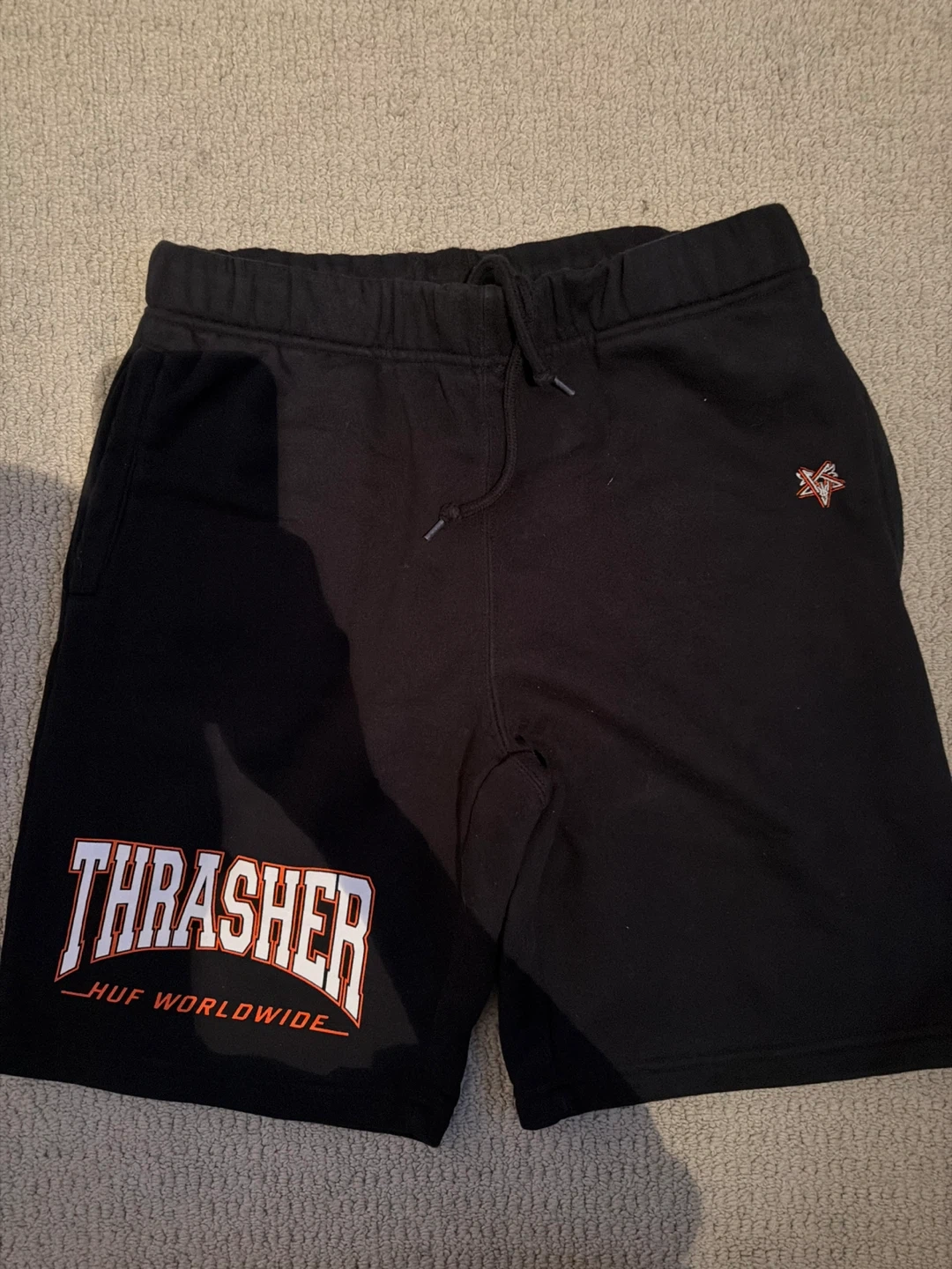 Black HUF x Thrasher sweatshorts with a large Thrasher logo graphic. Elastic waistband with a drawstring. Bought from Zumiez couple of years ago, barely worn.