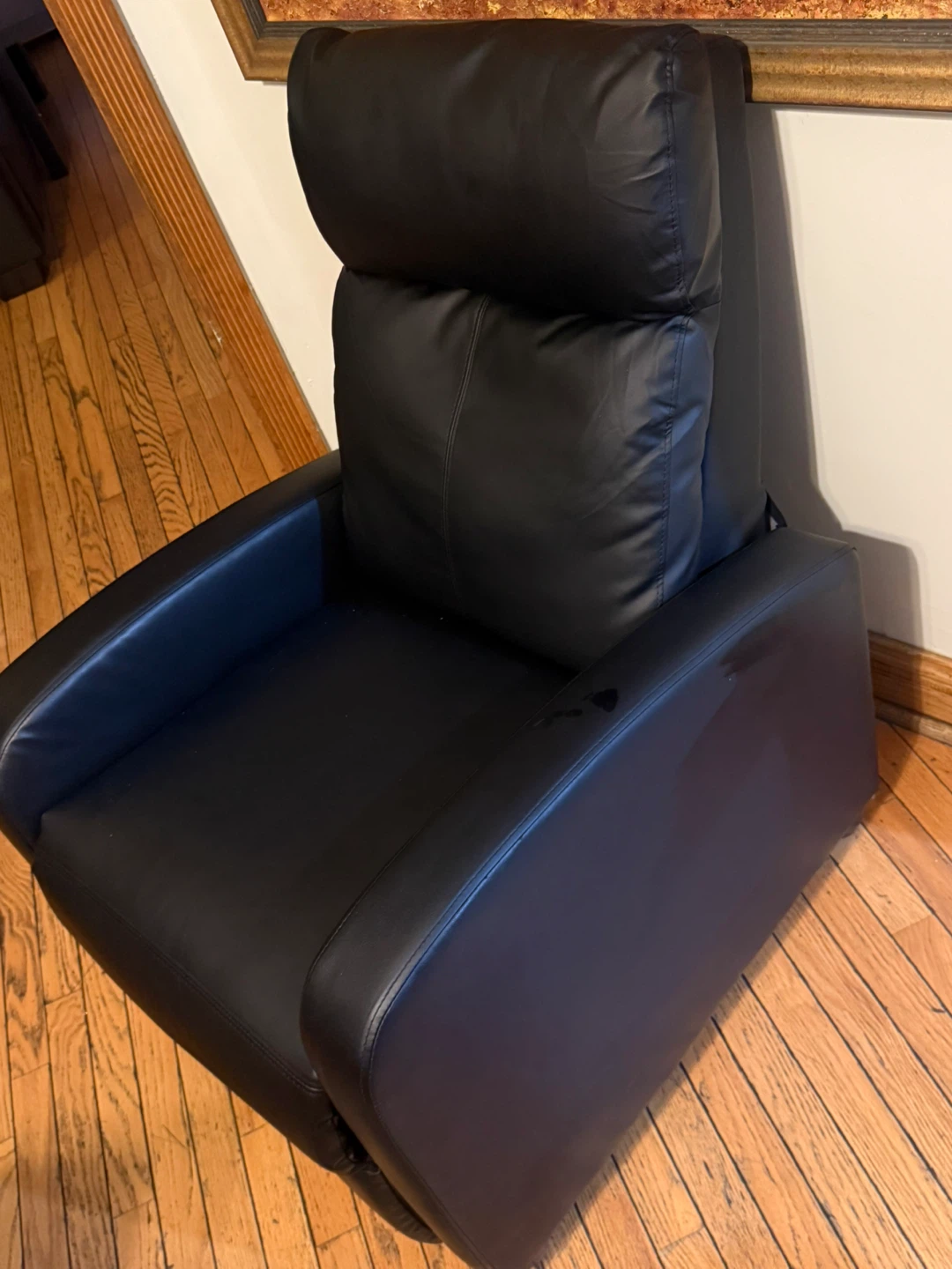 Selling a matching set of four comfortable black recliner chairs. All in excellent condition with soft faux-leather upholstery, cushioned backrests, and smooth reclining function. Perfect for a home theater, living room, office, or waiting area.