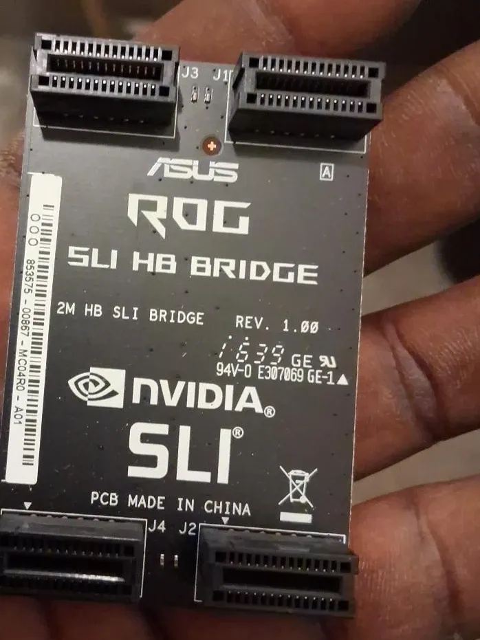 Selling an ASUS ROG NVIDIA SLI HB Bridge. It's a 2M HB SLI BRIDGE with REV 1.00. PCB is made in China.
