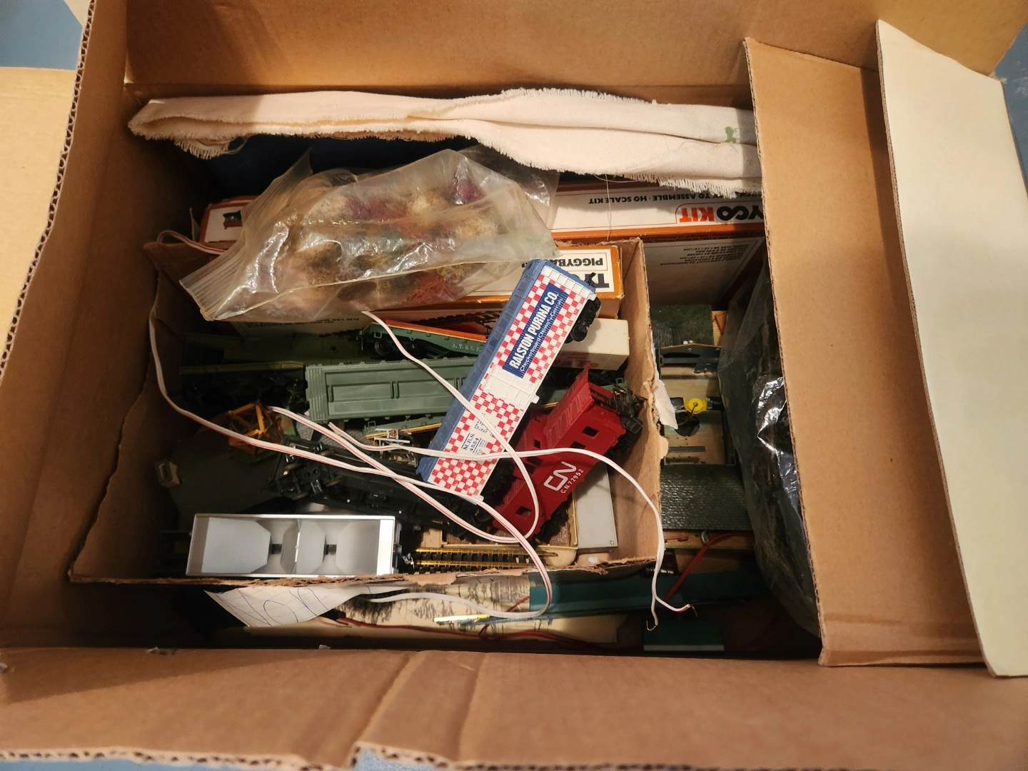 A box of vintage model train pieces including train cars, track, and scenery. There's a lot of pieces to the set so I wanted to leave everything in the box. I'm renovating my basement and just need it gone and would like to see it go to someone who would find enjoyment from it .