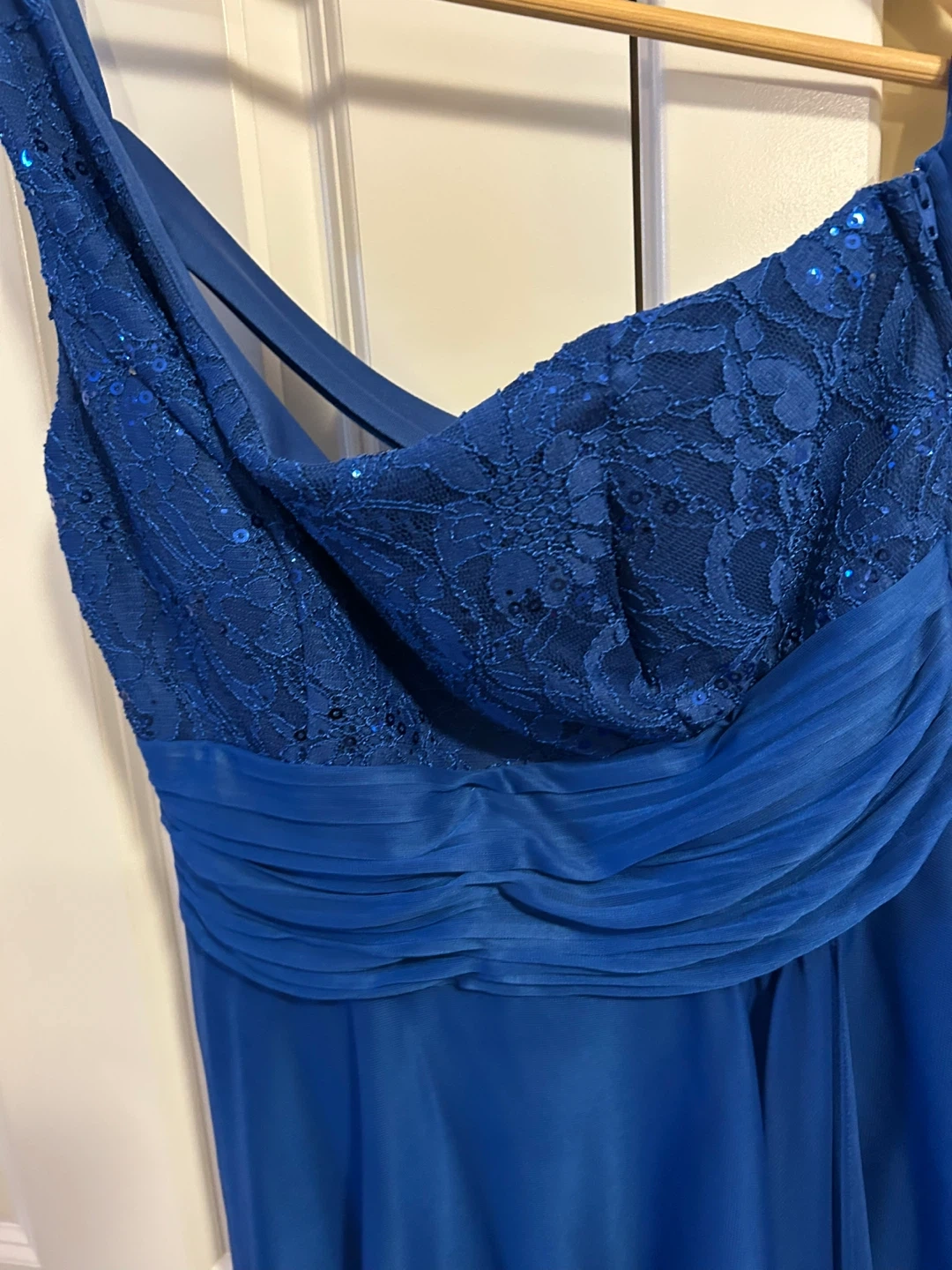 Beautiful royal blue bridesmaid dress with lace bodice and sequin accents. Features a flattering ruched waistband and flowing chiffon skirt. This dress is perfect for formal events and weddings!