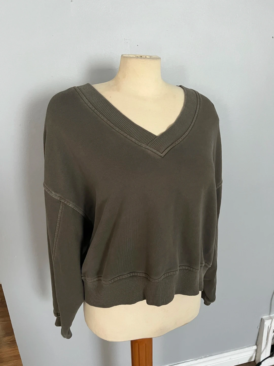 Selling a House Party v-neck olive green sweater from Aerie. It's a super cute basic and is super comfy and warm. Can be worn off the shoulder or on. Great for layering.