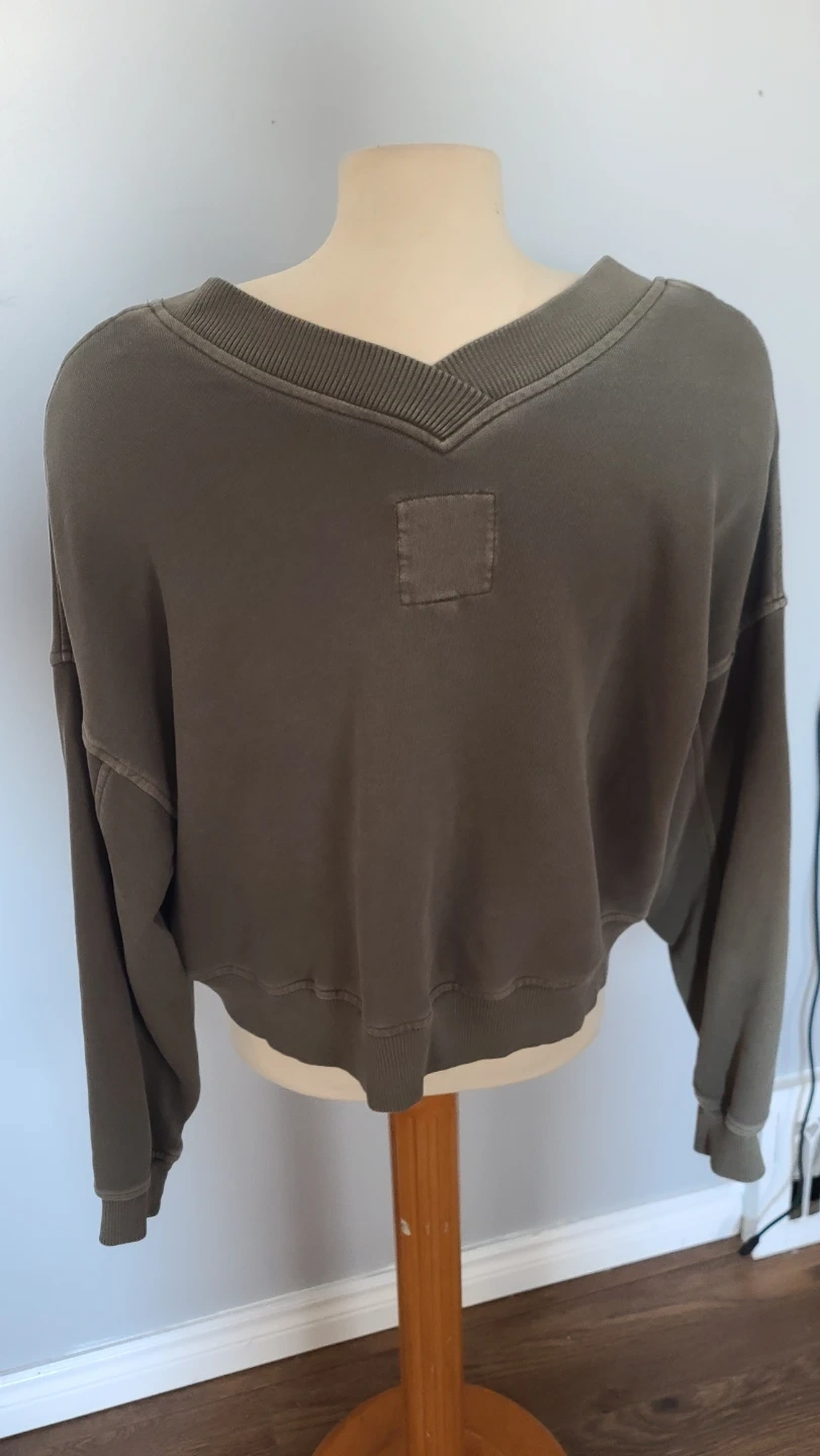 Selling a House Party v-neck olive green sweater from Aerie. It's a super cute basic and is super comfy and warm. Can be worn off the shoulder or on. Great for layering.