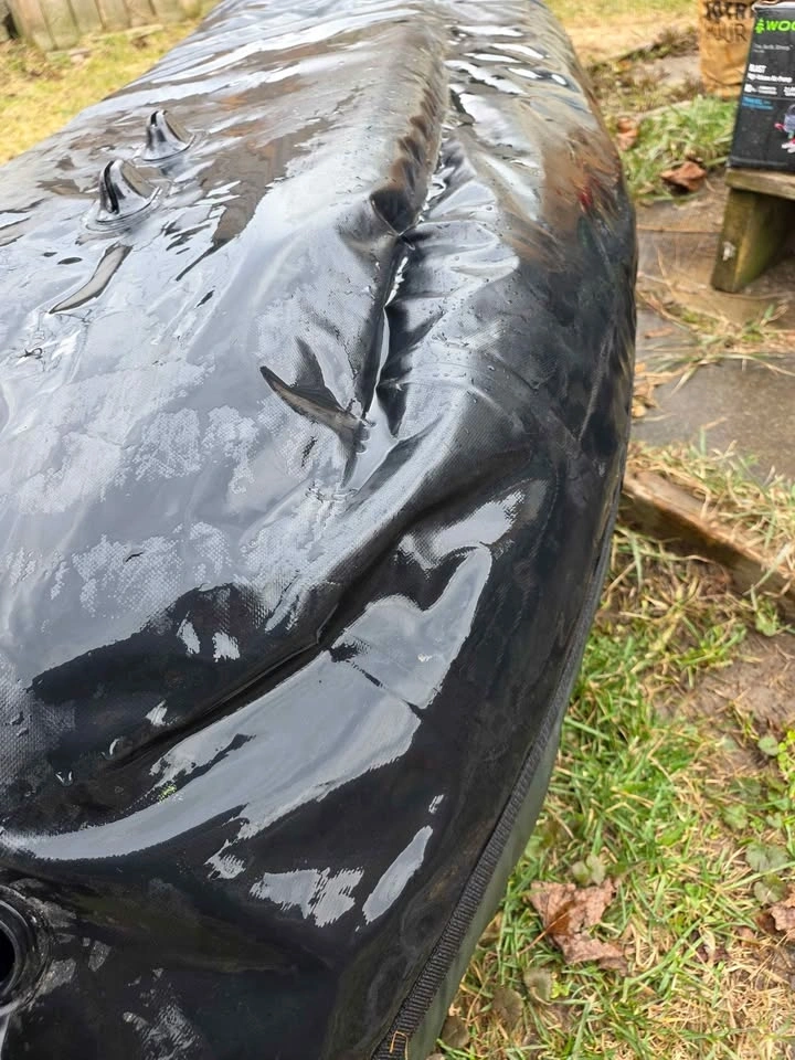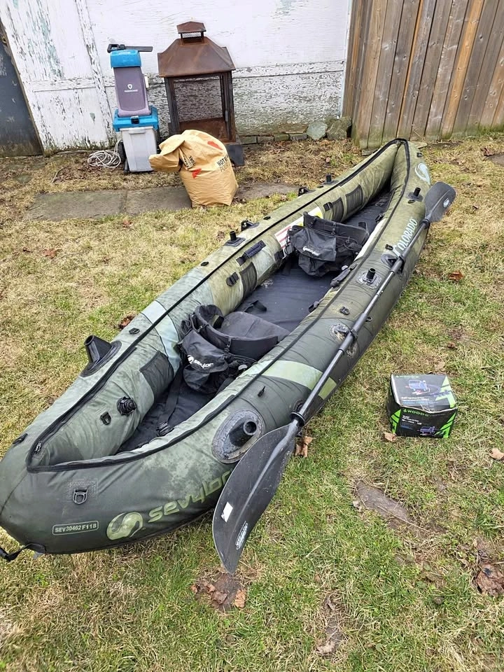 I've had this kayak for 2 years and only used it a handful of times. It works great for getting on the water without needing a truck and is good for fishing. No leaks or tears on the bottom, it's really thick and tough. Floor, sides, and seats all inflate, and there are storage nets on the backs of the seats. Comes with the proper pump to inflate it. You can buy a trolling motor mount for it as well. Goes for $800+ new on Amazon.