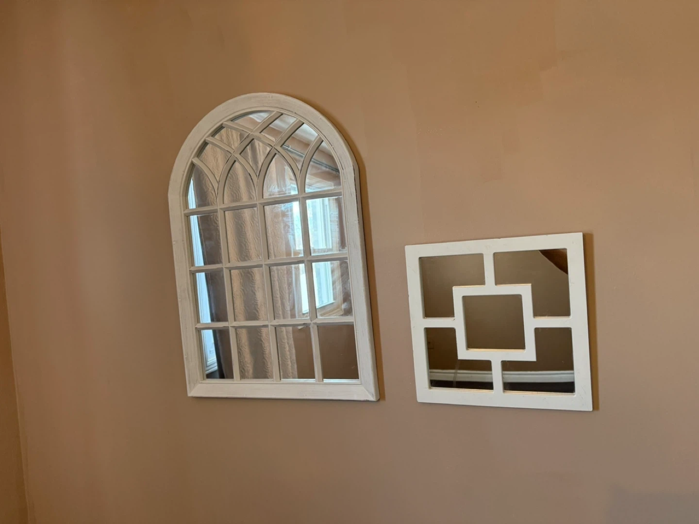 Two decorative wall mirrors, one with an arched, window pane design and the other a square geometric pattern. Both have white distressed frames. They're lovely for adding a touch of elegance to any room!