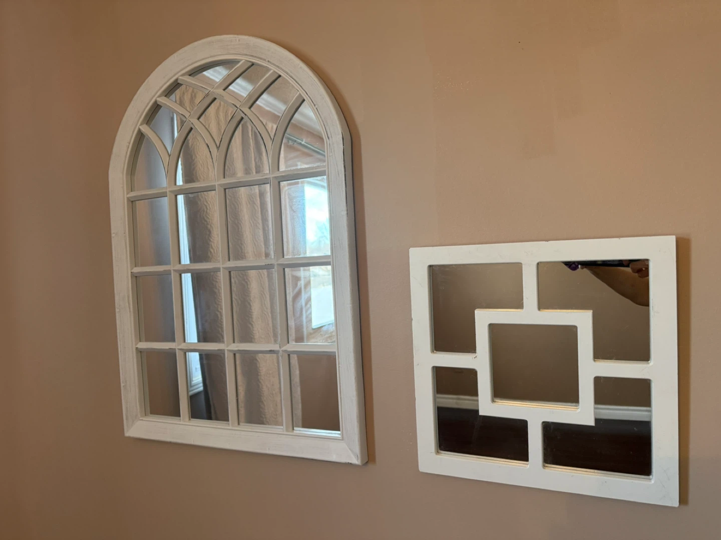 Two decorative wall mirrors, one with an arched, window pane design and the other a square geometric pattern. Both have white distressed frames. They're lovely for adding a touch of elegance to any room!