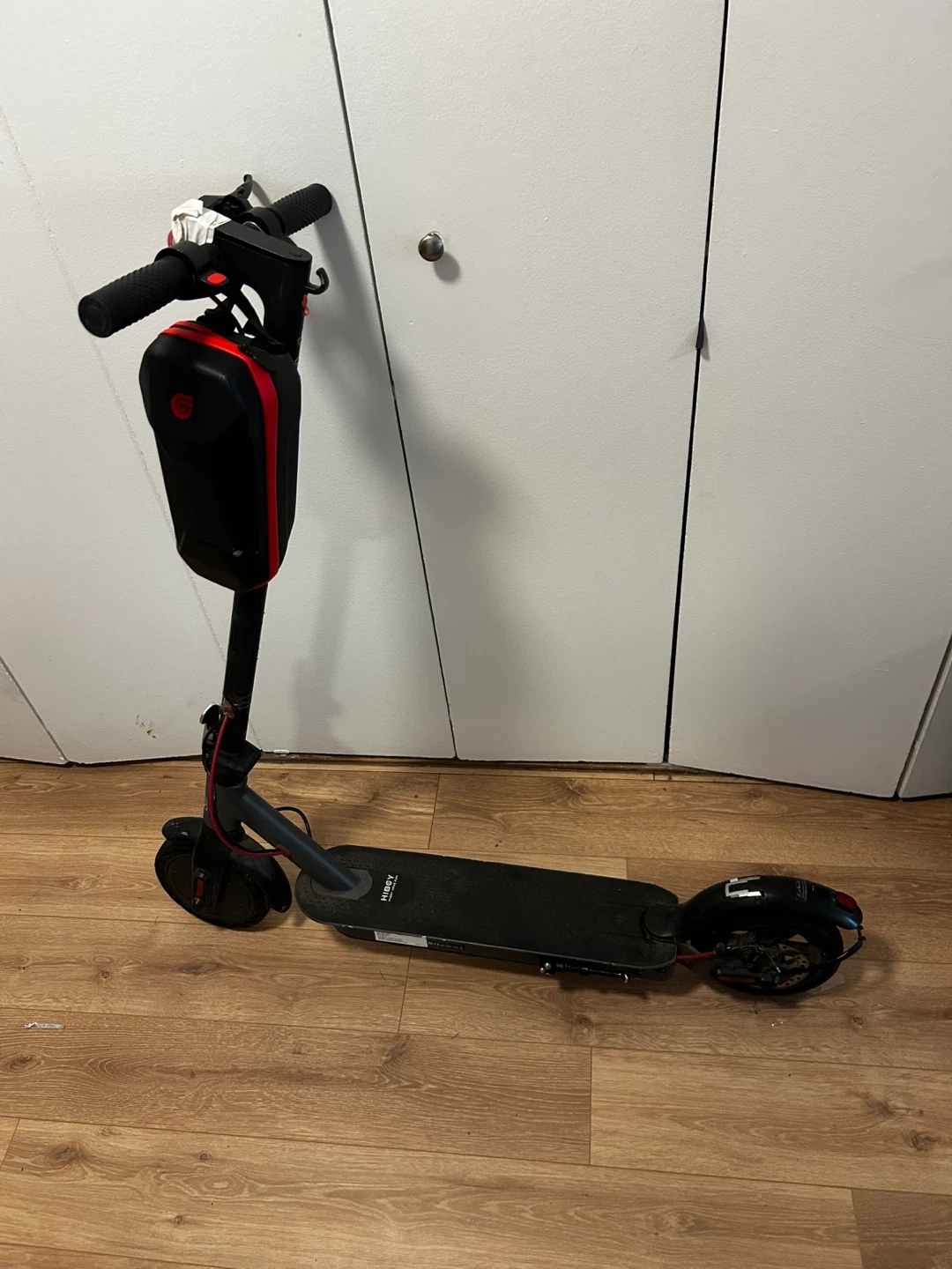 Selling a Hiboy electric scooter. It's black and has a red accent bag attached to the front. Great for getting around!