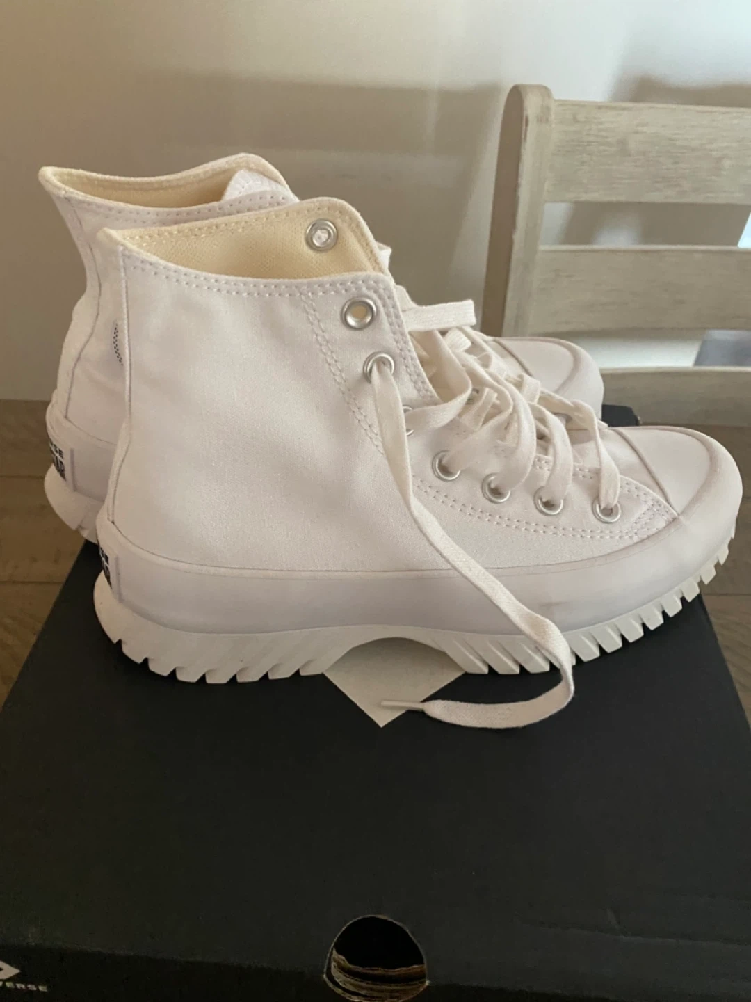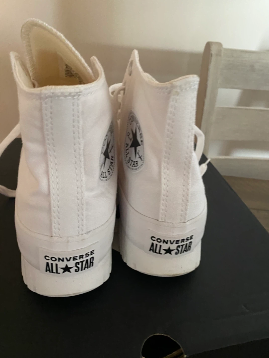 These are white Converse All Star Chuck Taylor platform high top sneakers. They're made of canvas with a rubber sole. Comes with box