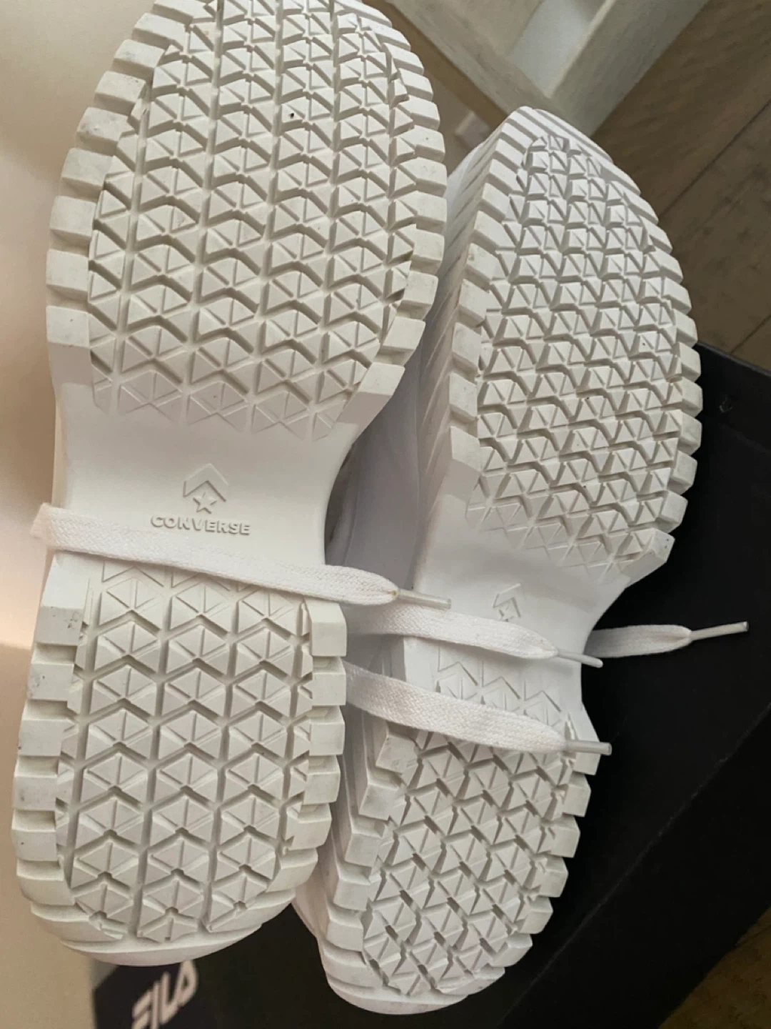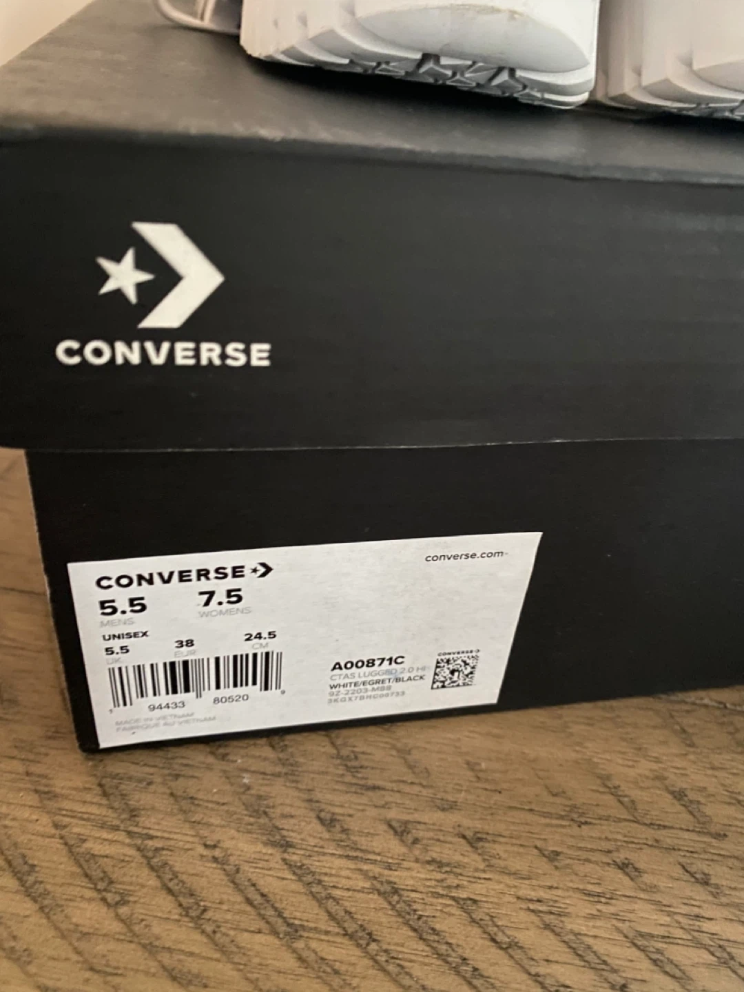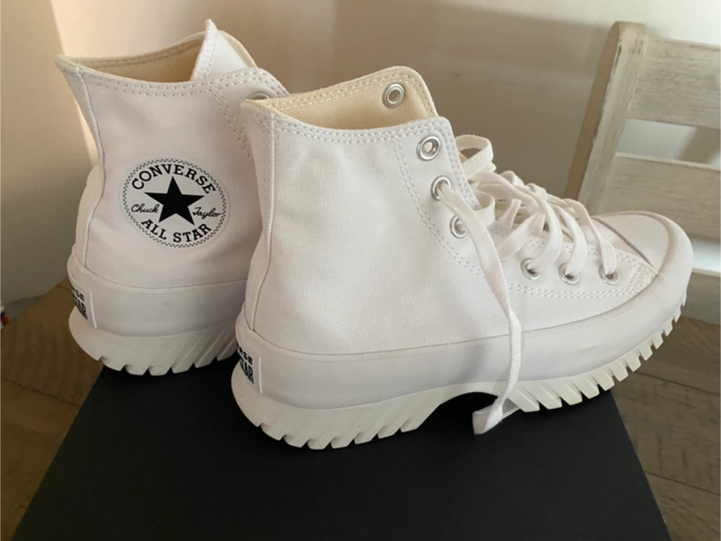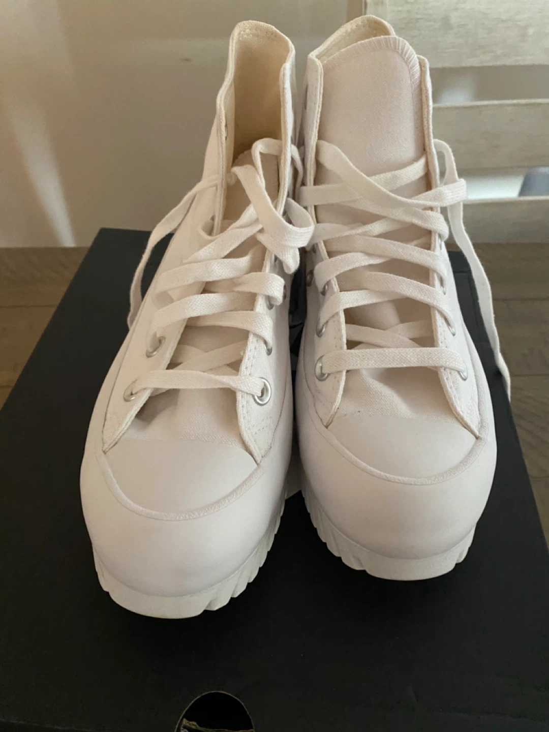 These are white Converse All Star Chuck Taylor platform high top sneakers. They're made of canvas with a rubber sole. Comes with box