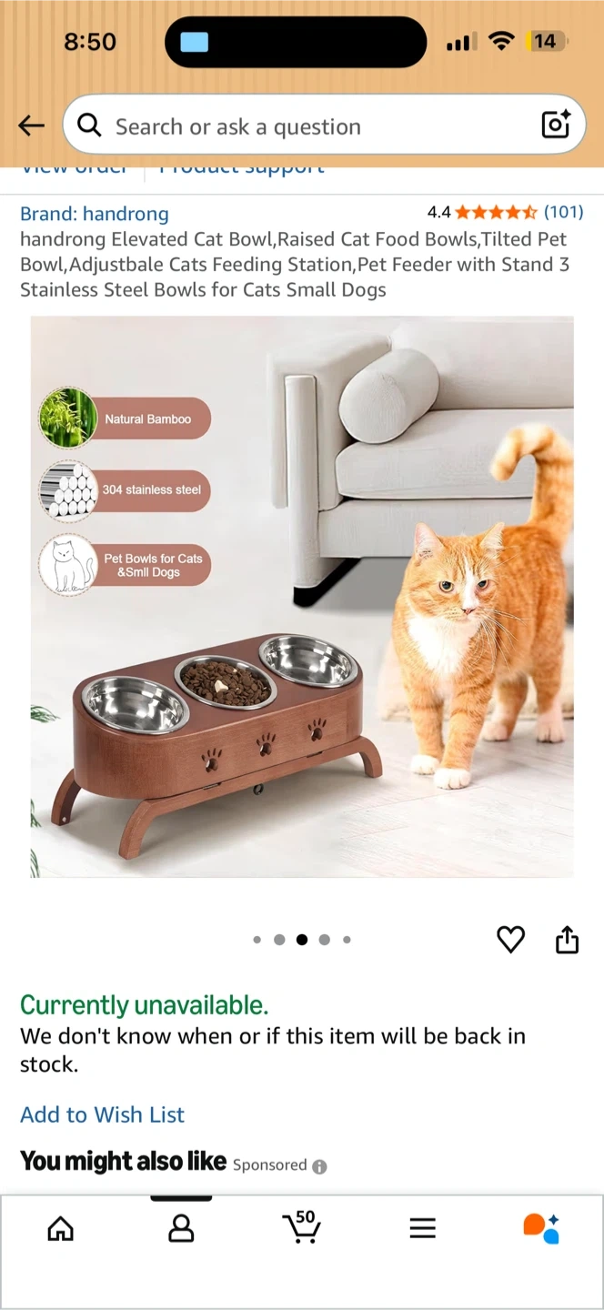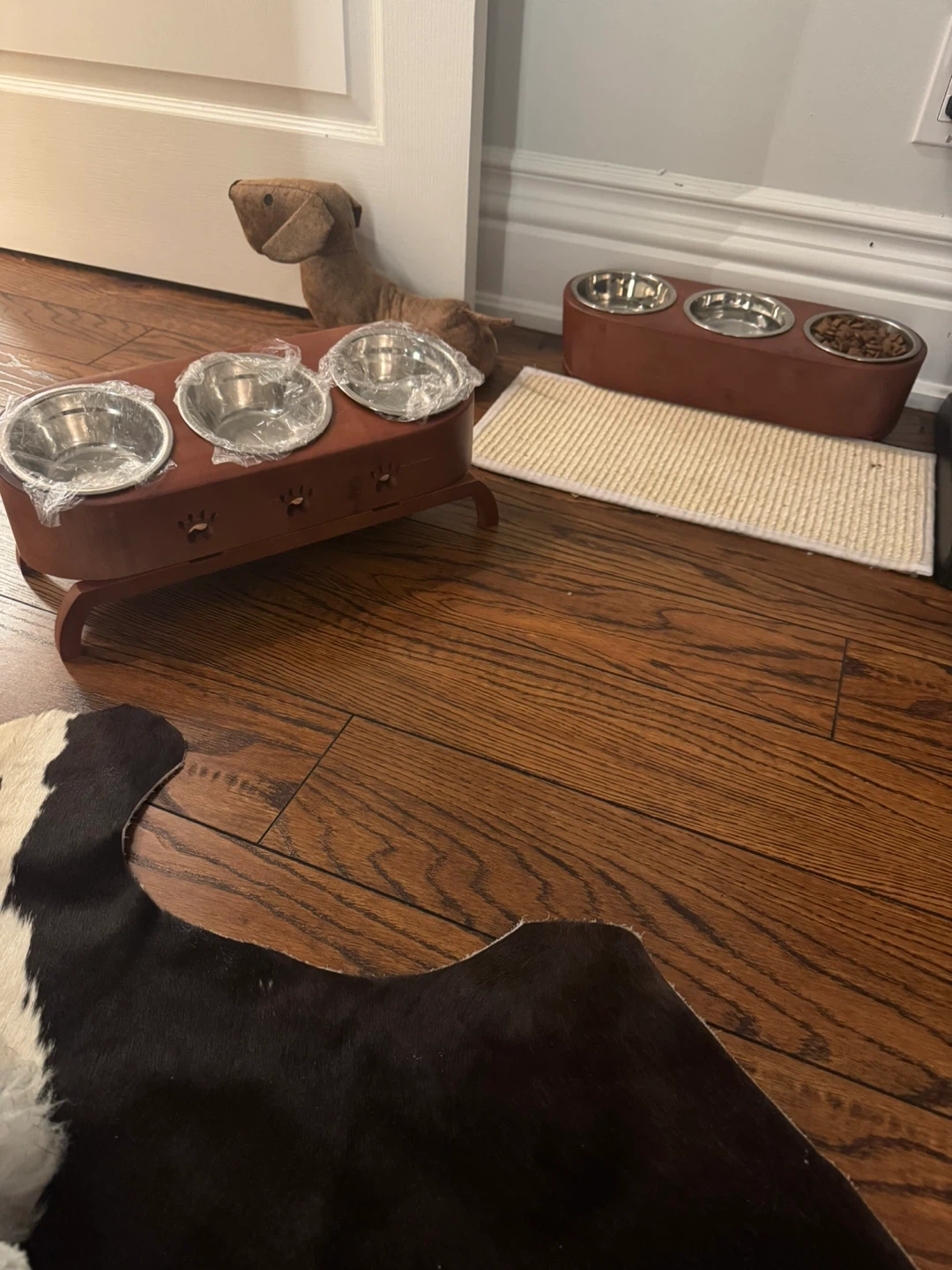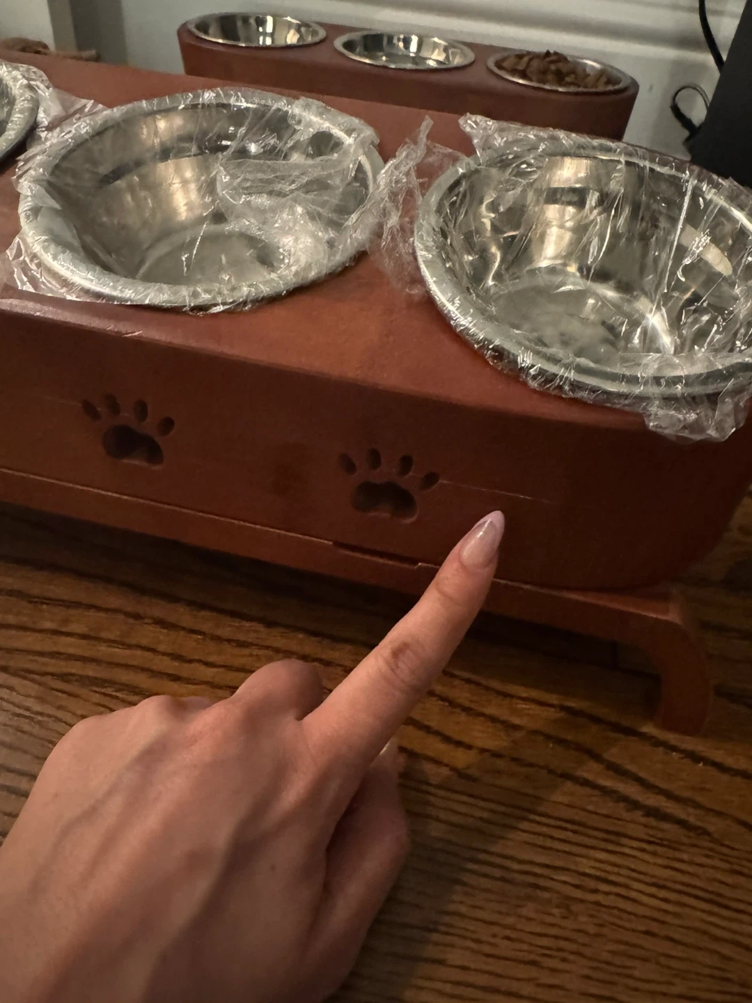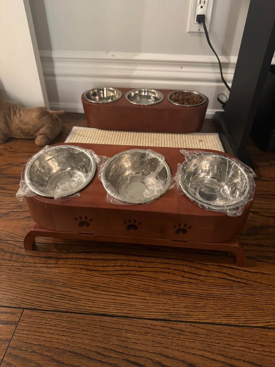 This is a Handrong elevated cat bowl set with three stainless steel bowls. The stand is made from wood and has paw print accents. It's designed to tilt for easier feeding. There are some small scratches thats why I got new one and selling this one. Never used it.