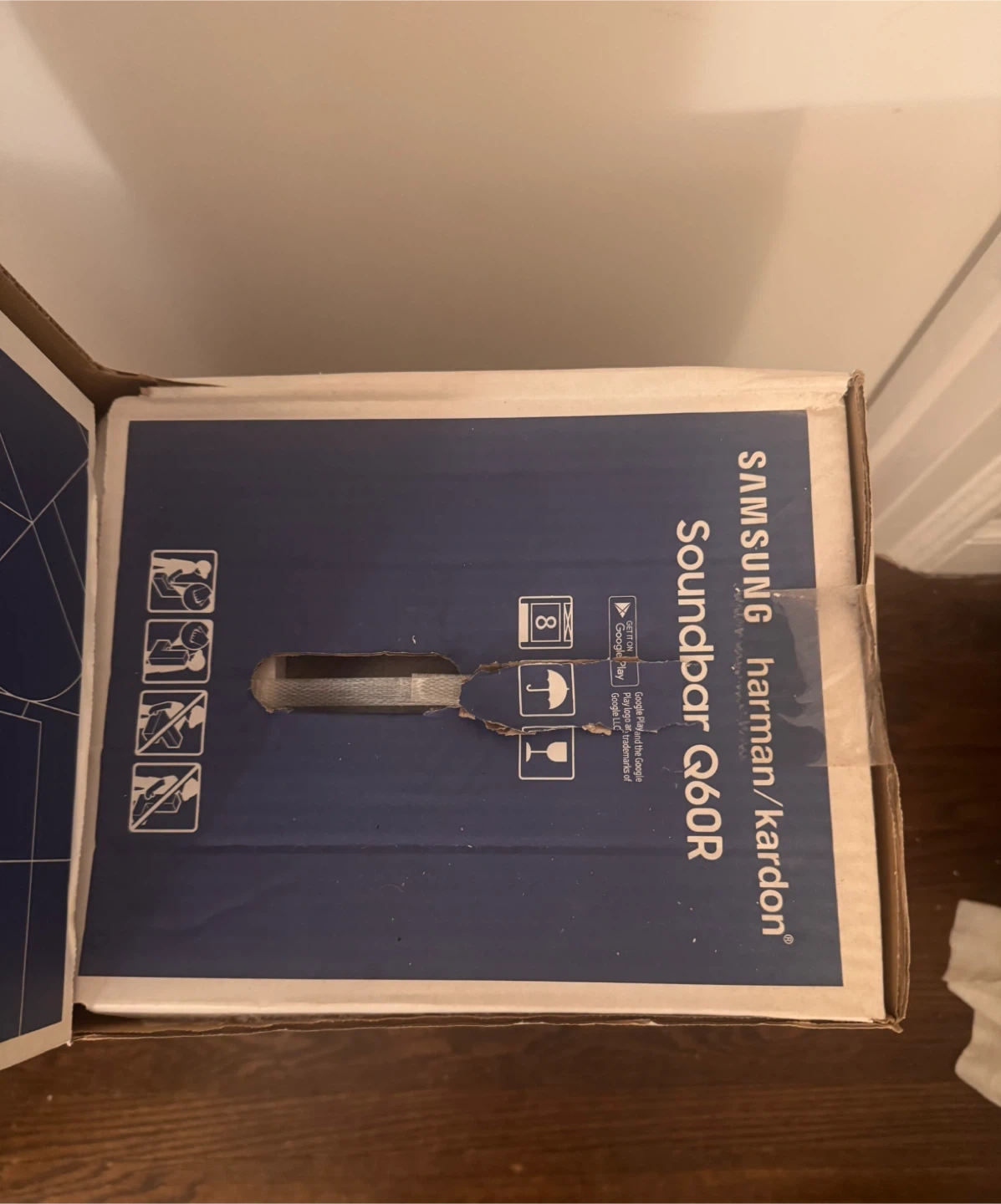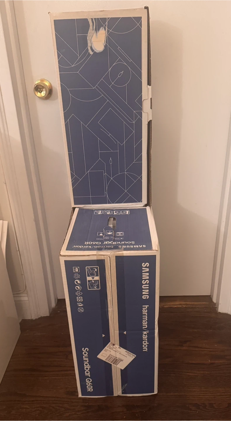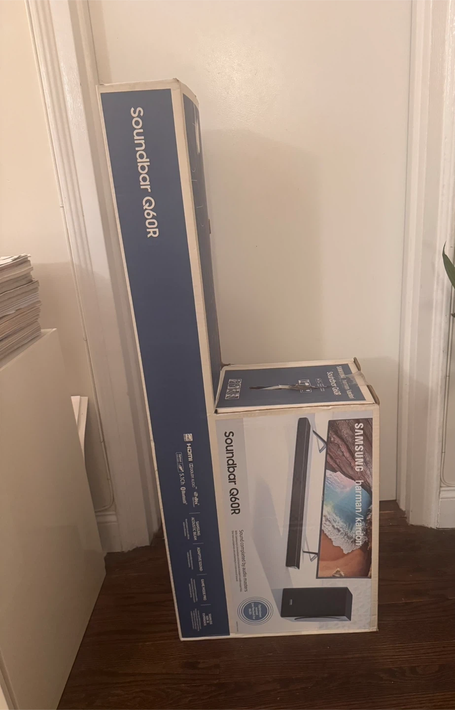 Samsung Harman Kardon Soundbar Q60R. New in sealed box. This soundbar offers immersive audio for your home theater setup. It's compatible with various devices.