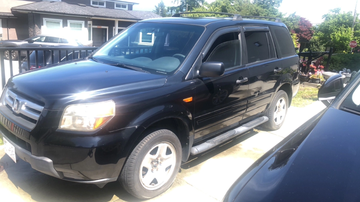 Black Honda Pilot. 107,018 miles or 172,228 kilometers. SUV. Roof rack. Needs interior cleaning. Minor wear and tear