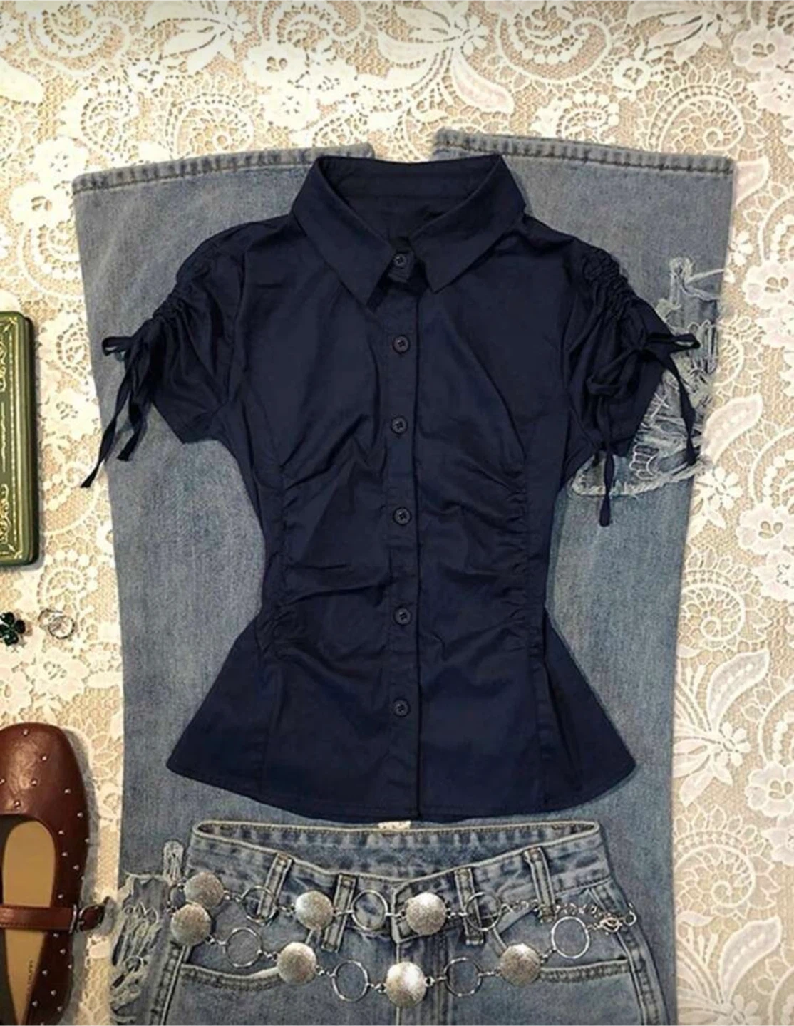 A navy short-sleeve button-up shirt with ruched detailing on the sides and tie details on the sleeves. It has a collared neckline and a button-up front. The material appears to be a cotton blend.