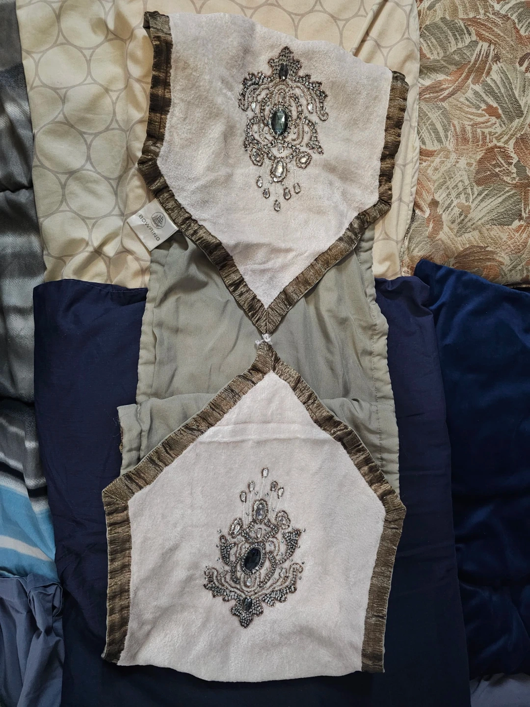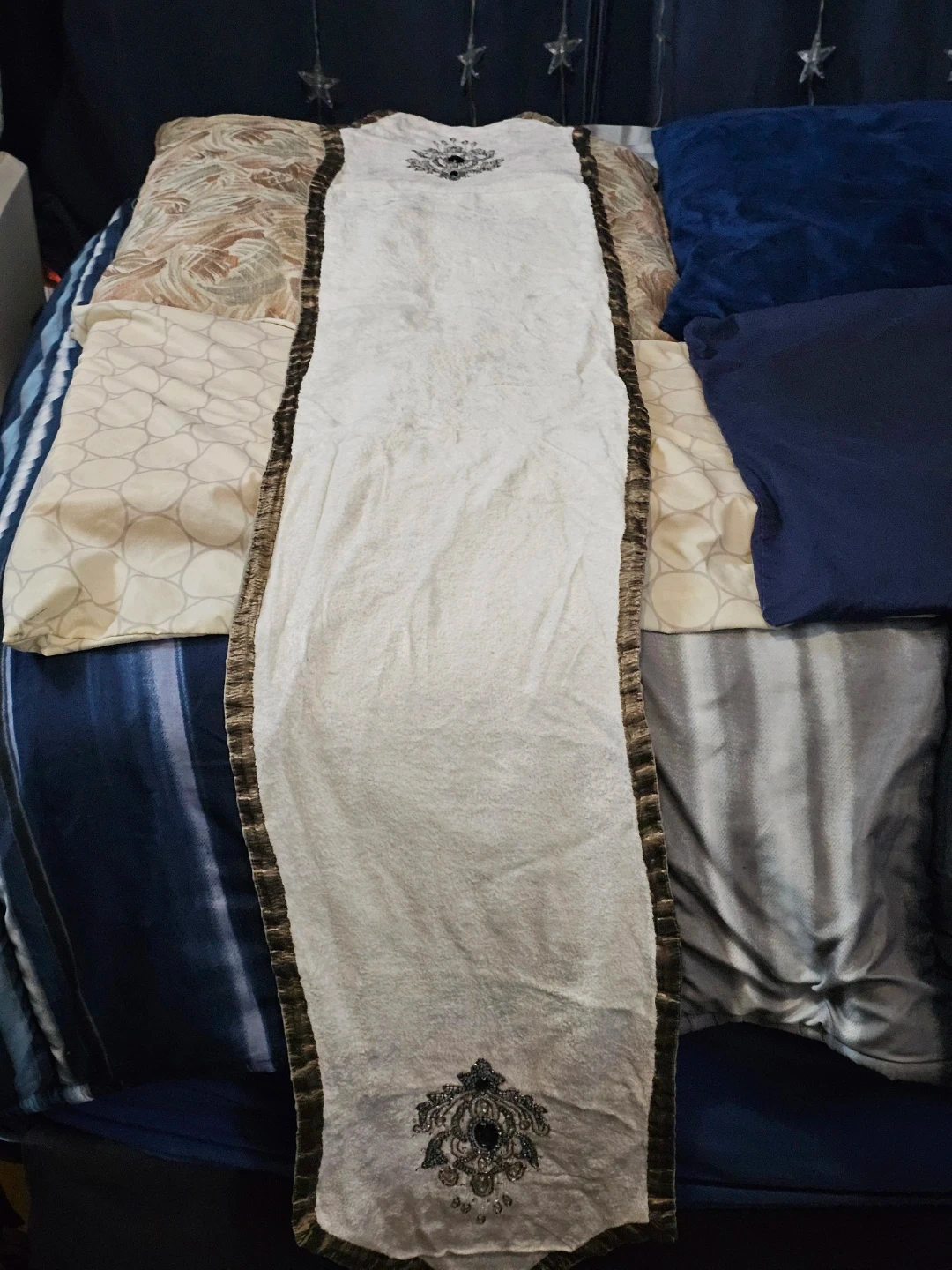 Decorative table runner with intricate beadwork and metallic trim. Made from 50% Polyester and 50% Viscose Velvet. Dry clean only. Perfect for adding a touch of elegance to your dining table!